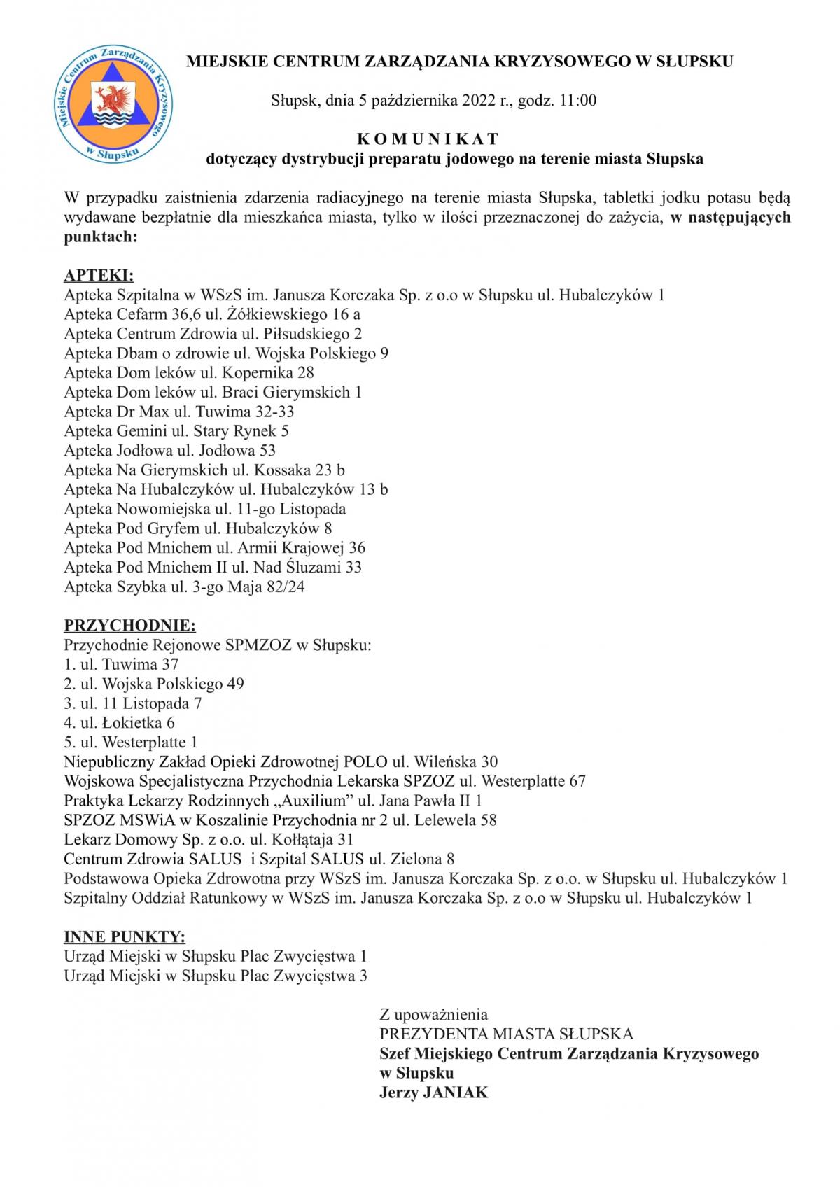 Zachęcamy do zapoznania się z broszurą informacyjną dotyczącą profilaktyki jodowej a także komunikatem Miejskiego Centrum Zarządzania Kryzysowego w Słupsku dotyczącym dystrybucji preparatu jodowego na terenie miasta Słupska.