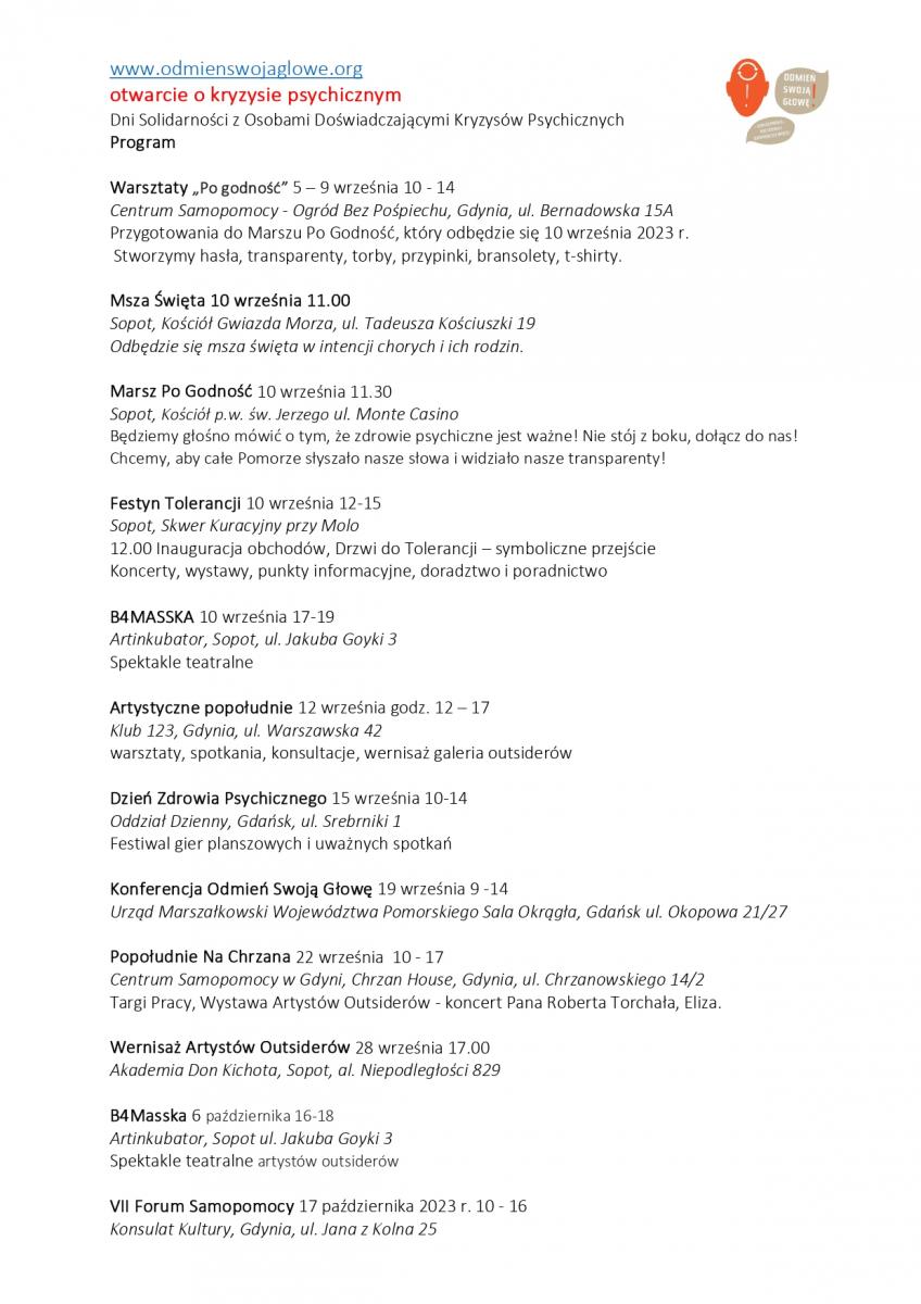 W trakcie Di Solidarności w Gdańsku, Gdyni, Sopocie i Kościerzynie odbędzie się szereg wydarzeń, m.in.: konferencja pt. "Otwarcie o kryzysie psychicznym", VII Pomorskie Forum Samopomocy, liczne spotkania, debaty i warsztaty.