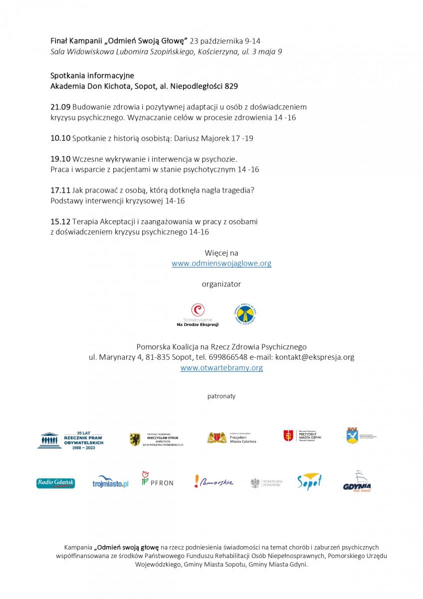 Pomorska Koalicja na Rzecz Zdrowia Psychicznego w dniach 5 września-23 października zaprasza na obchody Dni Solidarności z Osobami Doświadczającymi Kryzysów Psychicznych. Dni będą częścią pomorskiej kampanii społecznej "Odmień swoją głowę".
