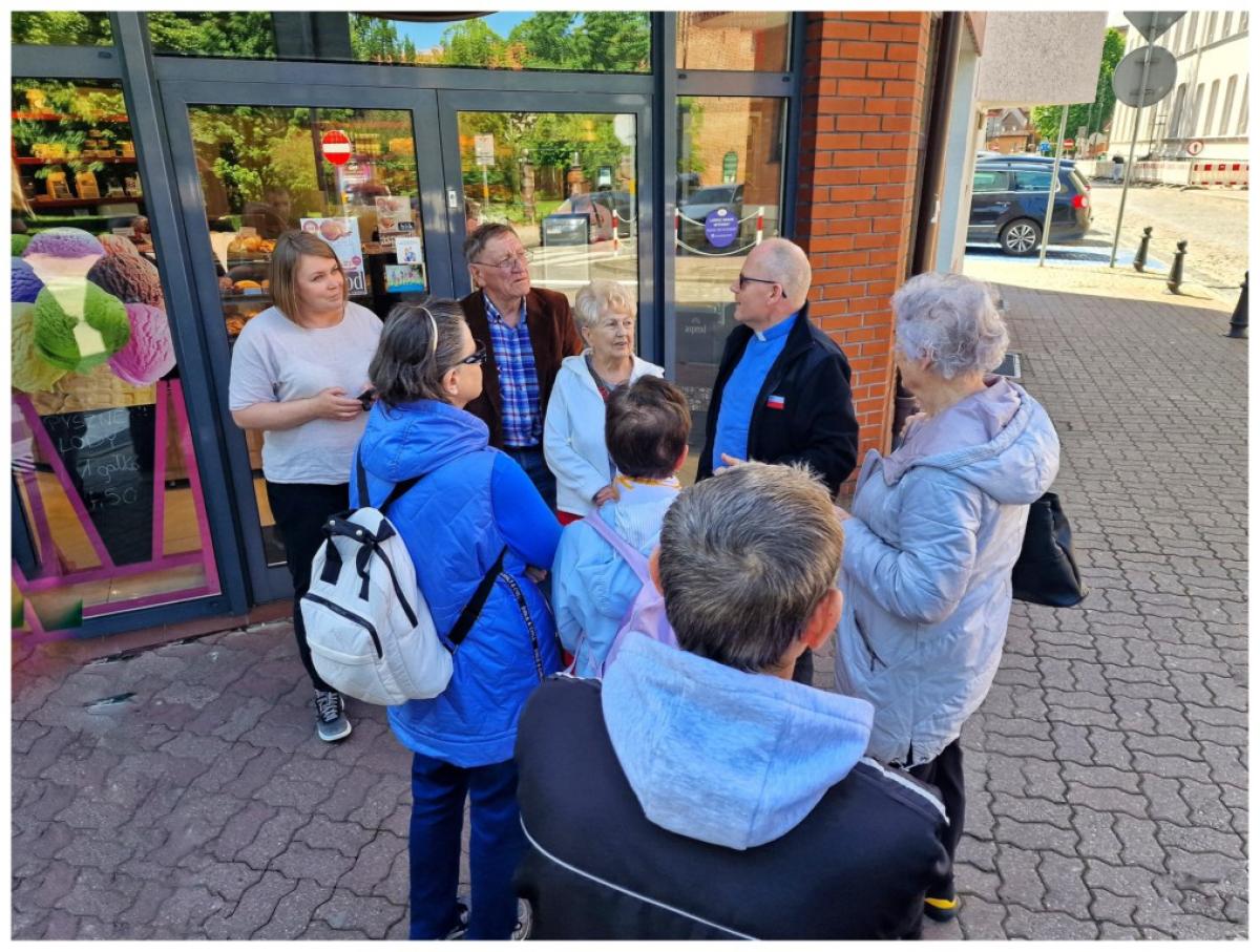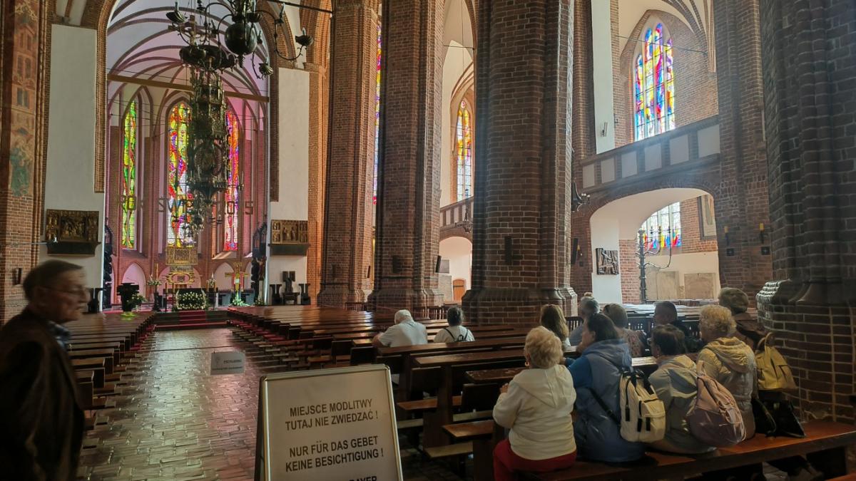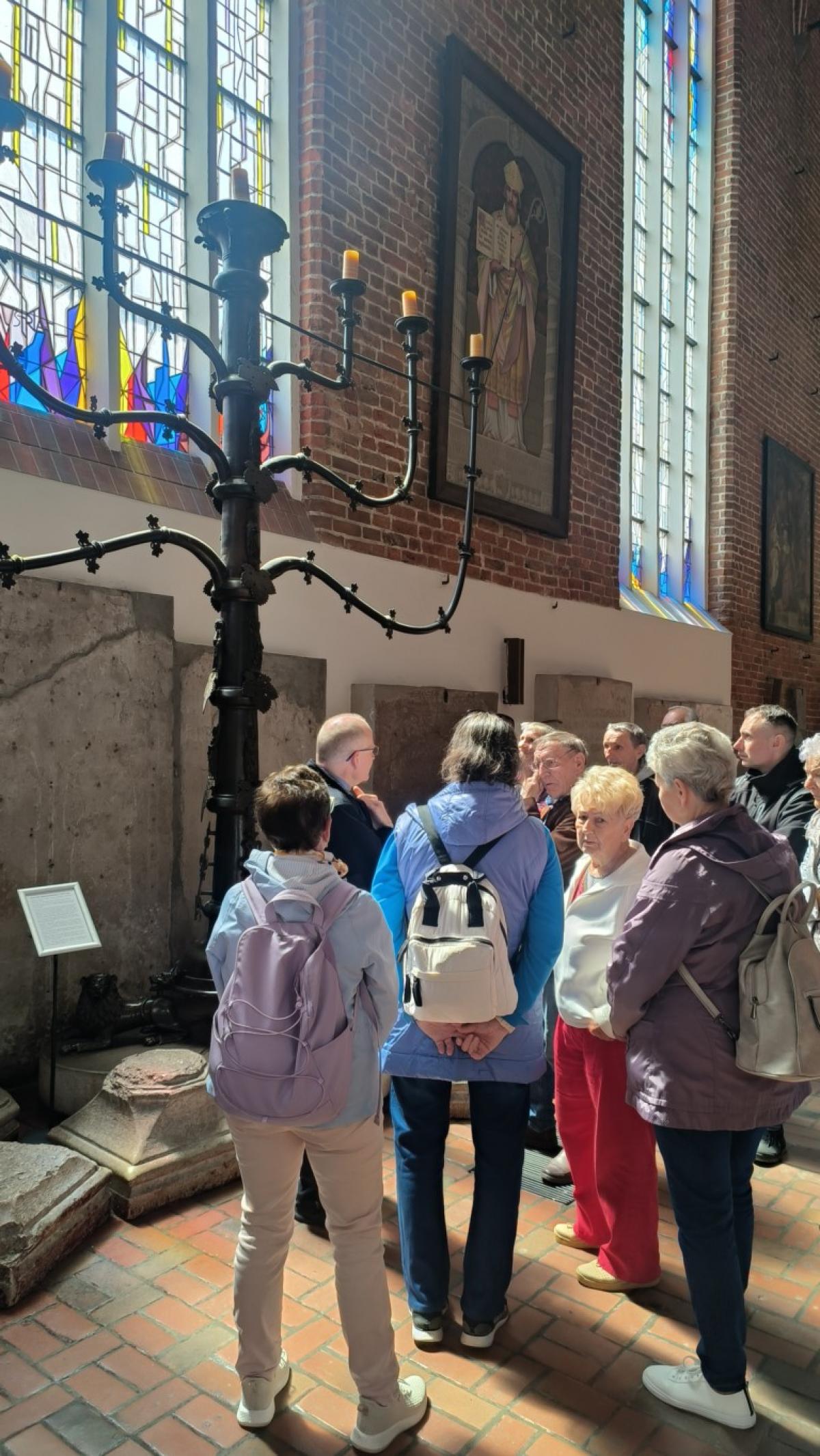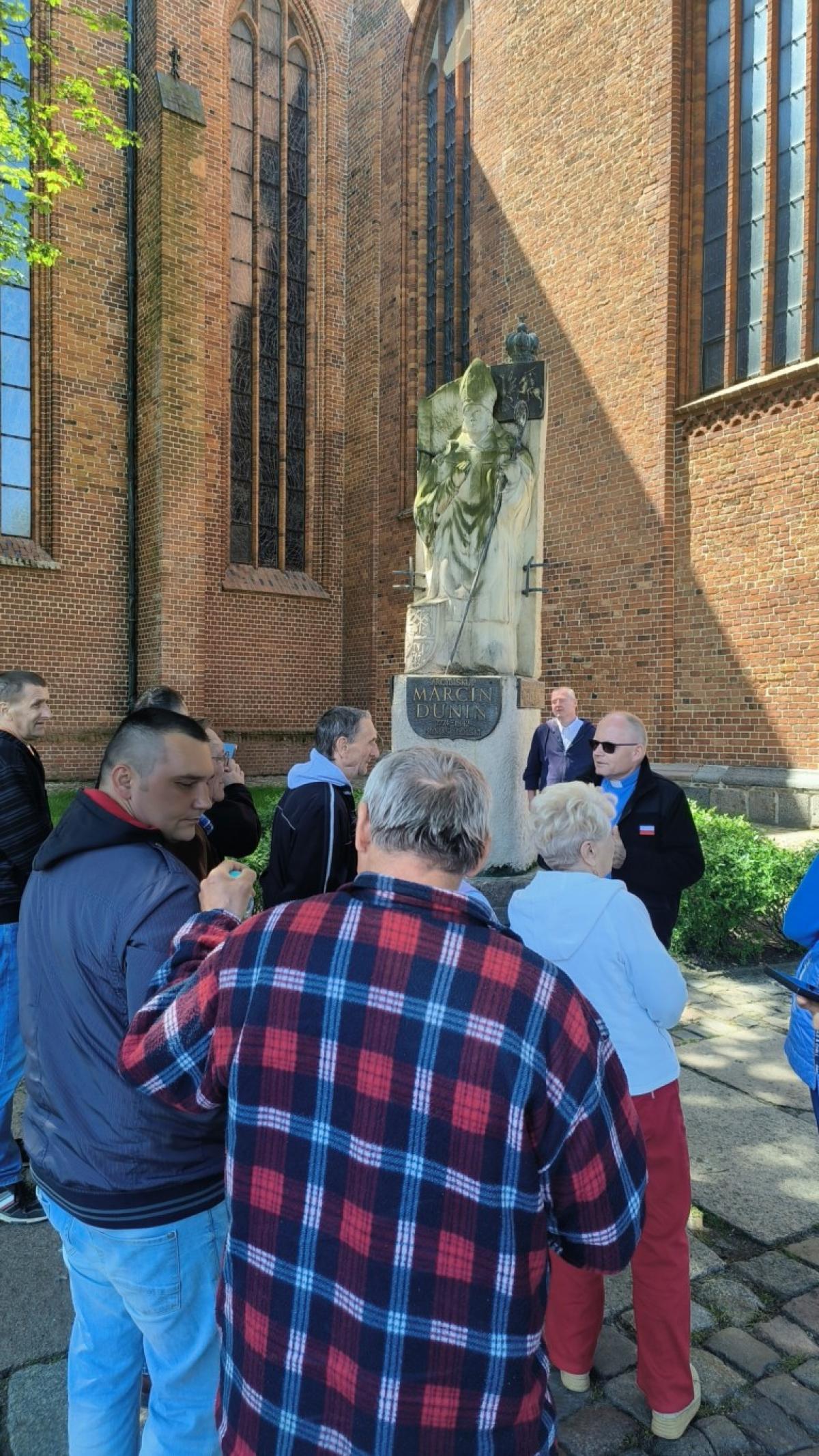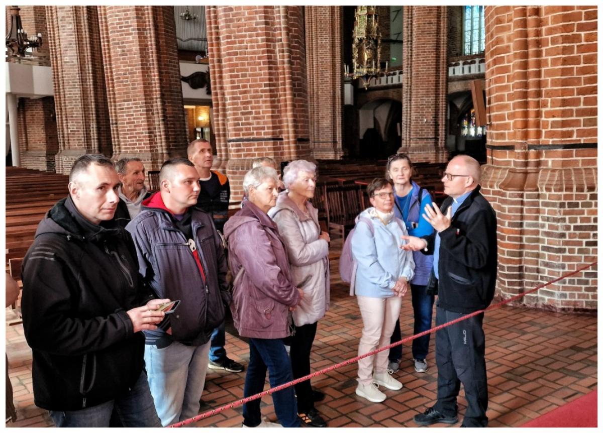 Kolejnym etapem naszej podróży był Kołobrzeg – miasto o bogatej historii chrześcijaństwa i pięknych świątyniach. Odwiedziliśmy tam kolejne kościoły, z których każdy emanuje wyjątkowym pięknem, spokojem i modlitwą minionych pokoleń. Zwiedziliśmy wnętrze i wieżę widokową oraz obszerną dzwonnicę Bazyliki Mariackiej w Kołobrzegu, skąd mogliśmy podziwiać panoramę miasta – widok, który zachwycił i skłonił do refleksji. Wszystkiemu towarzyszyły wspaniałe opowieści i ciekawostki Ks. Artura Dylewskiego, urodzonego w Kołobrzegu. Zostaliśmy również zaproszeni na przepyszny obiad w restauracji, którego organizacja była zasługą księdza Artura za co przesyłamy serdeczne dzięki i Bóg zapłać.