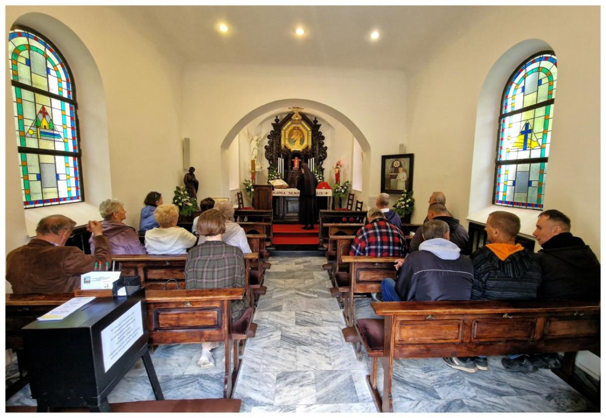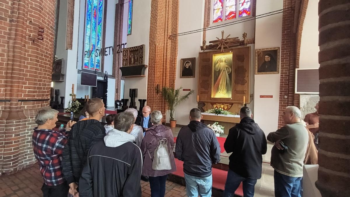 Po Eucharystii zostaliśmy serdecznie przyjęci przez siostrę zakonną, która z ogromnym zaangażowaniem i miłością do tego świętego miejsca opowiedziała nam historię powstania bazyliki i kaplicy. Szczególne wzruszenie wywołała opowieść o poświęceniu kaplicy przez Ojca Świętego Jana Pawła II w 1991 roku – niezapomniany moment, który pozostawił trwały ślad w sercach wiernych. Na zakończenie naszego pobytu w Chełmskiej Górze wpisaliśmy się do pamiątkowej księgi, pozostawiając ślad naszej obecności i modlitwy.