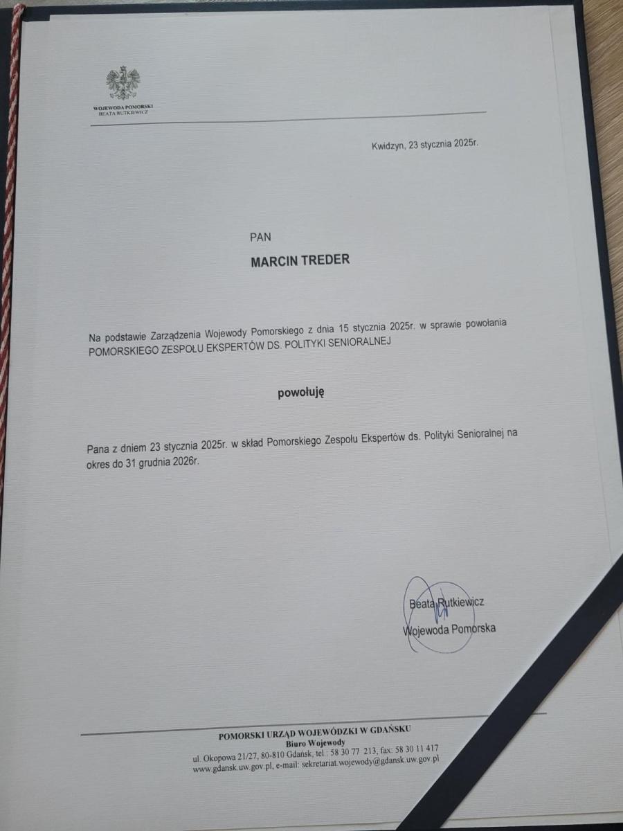 Kongres oprócz rozmów o wyzwaniach i rozwiązaniach na przyszłość był także okazją do uroczystego wręczenia powołań członkom pomorskiego Zespołu ekspertów ds. polityki senioralnej. Został nim m.in. Dyrektor Ośrodka, Marcin Treder.