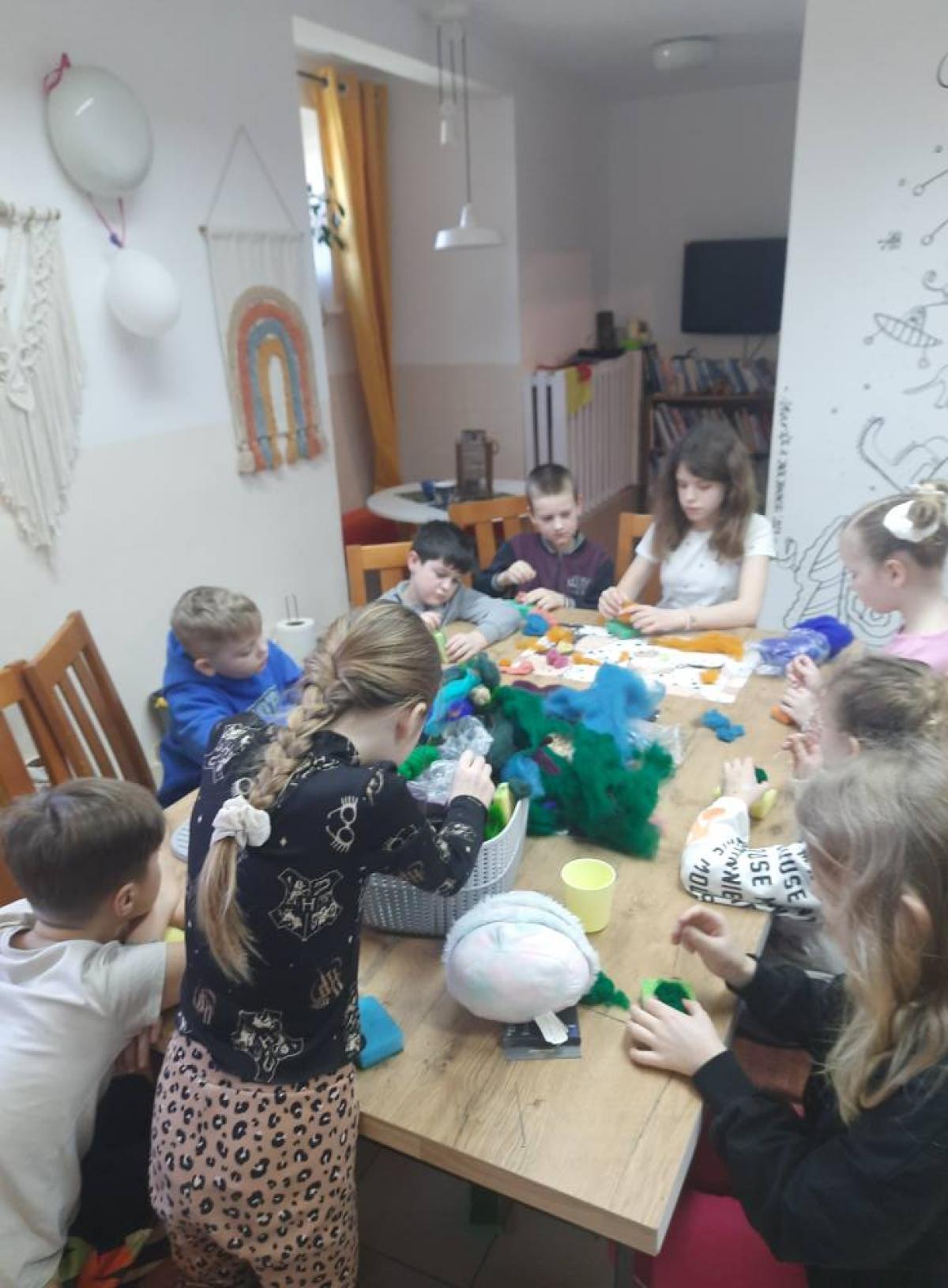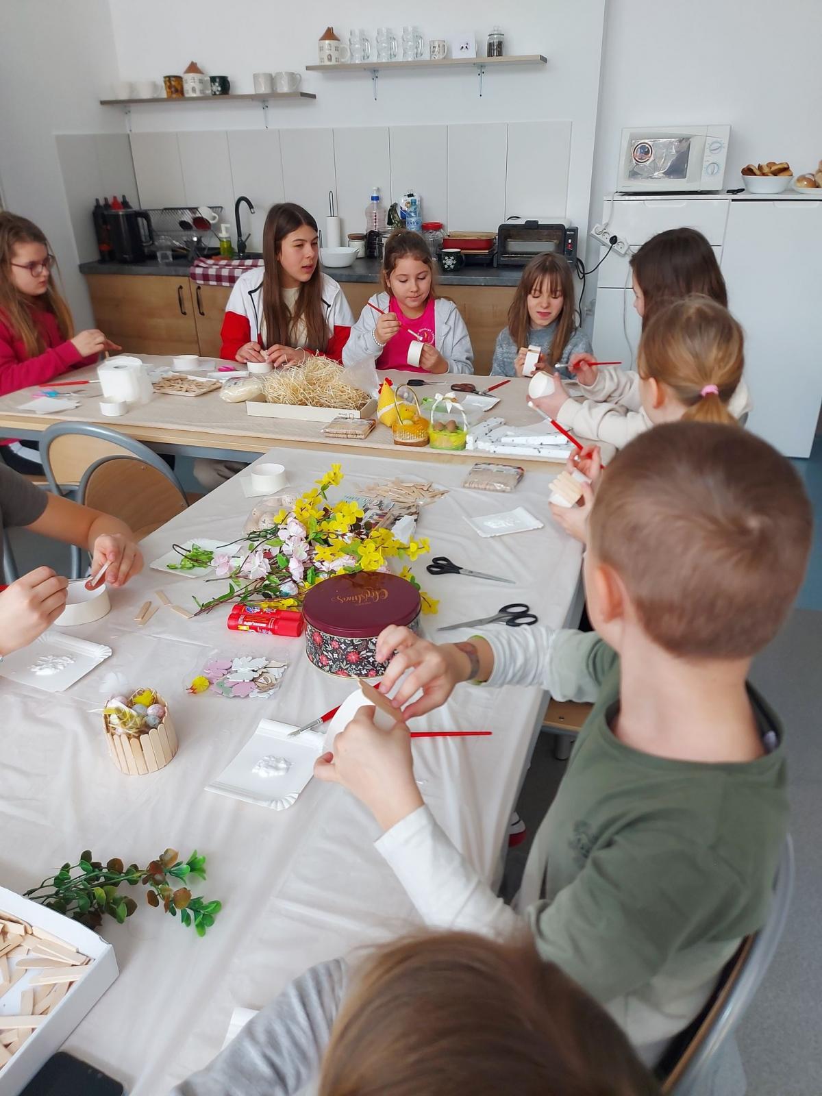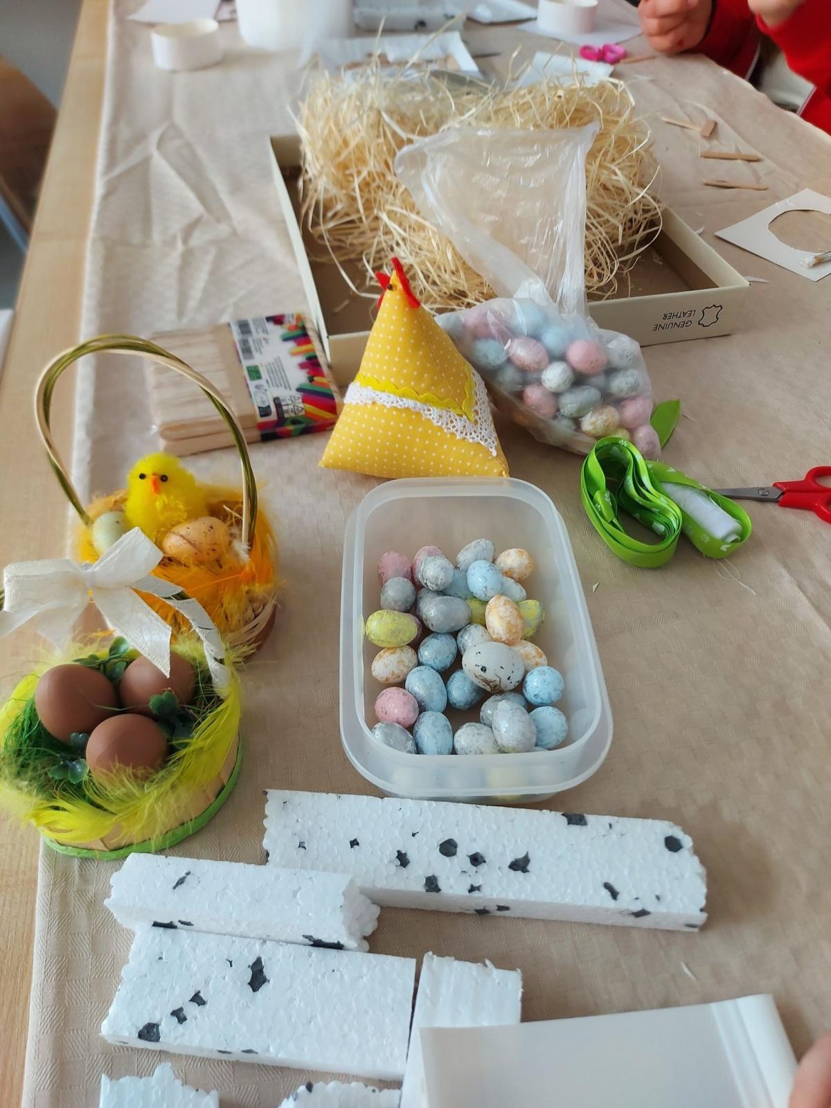Powstały również na zajęciach plastycznych liczne ozdoby imienne, zawieszki do telefonów oraz filcowe breloki na warsztatach rękodzieła. Dzieci wykonały koszyczki wielkanocne, naturalne i pastelowe. Każdy dobrał ulubioną kolorystykę.