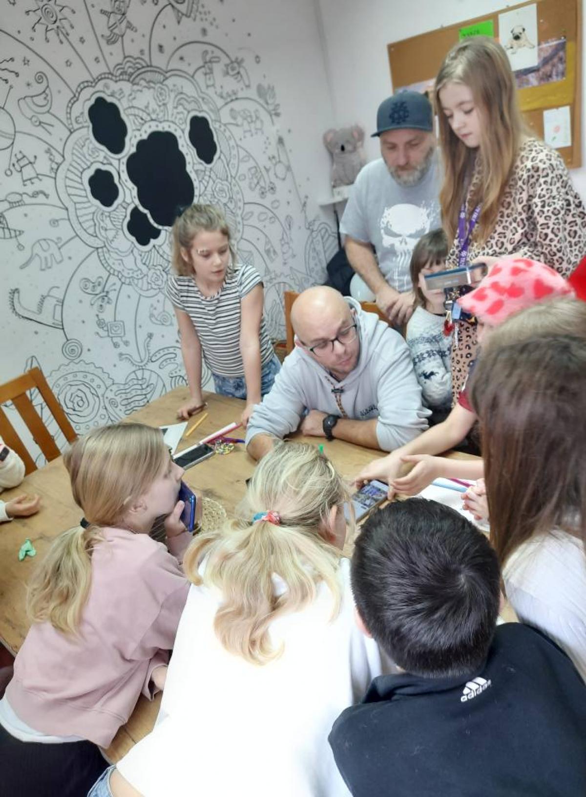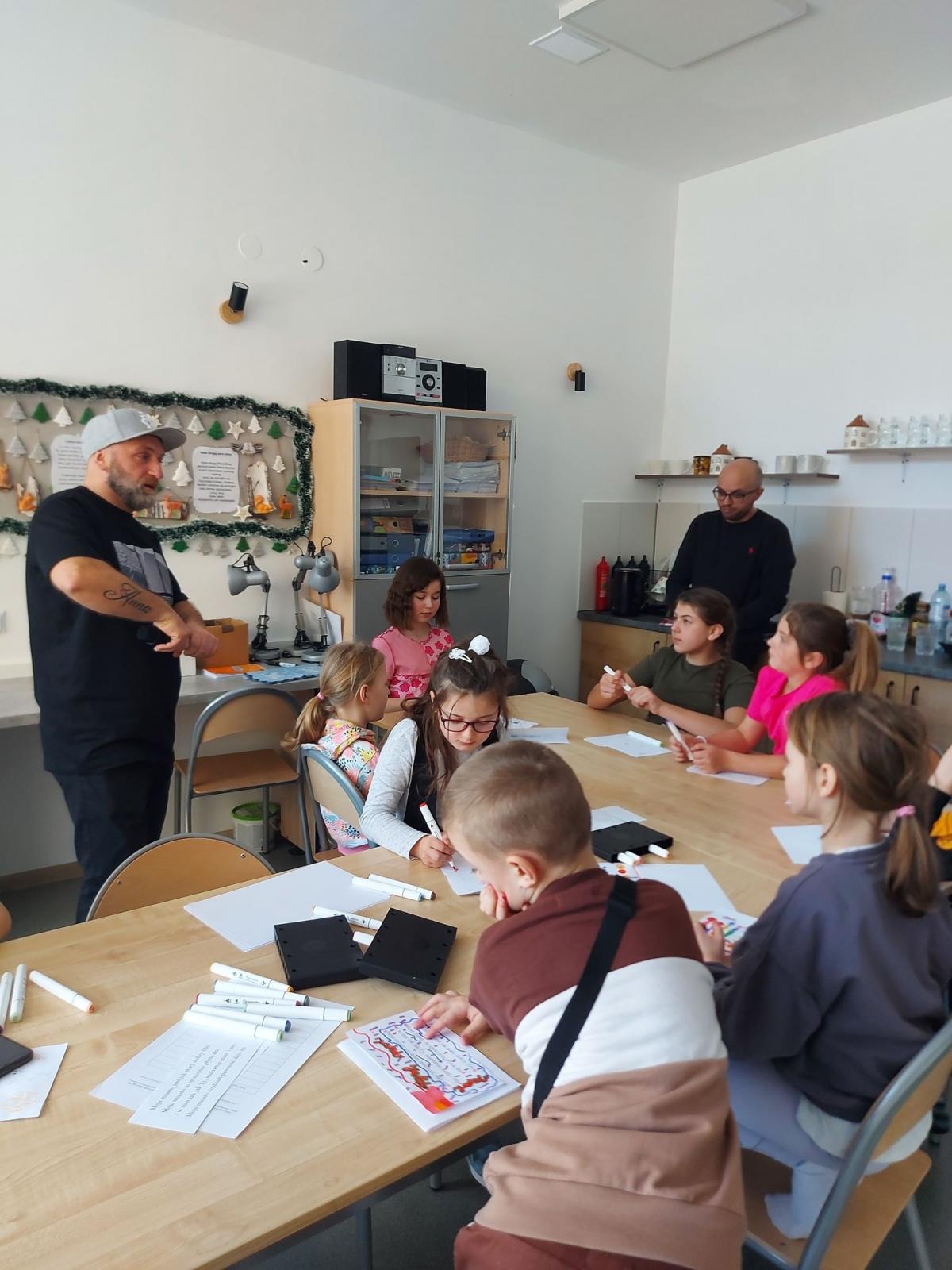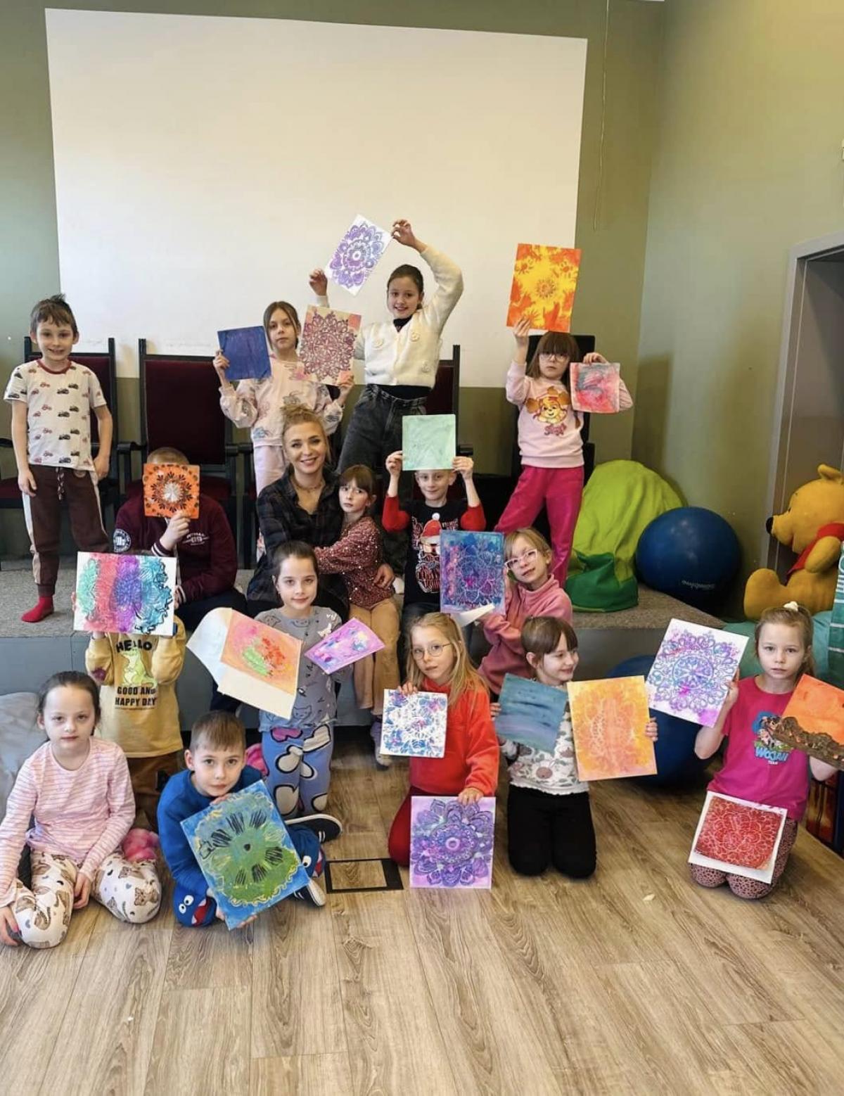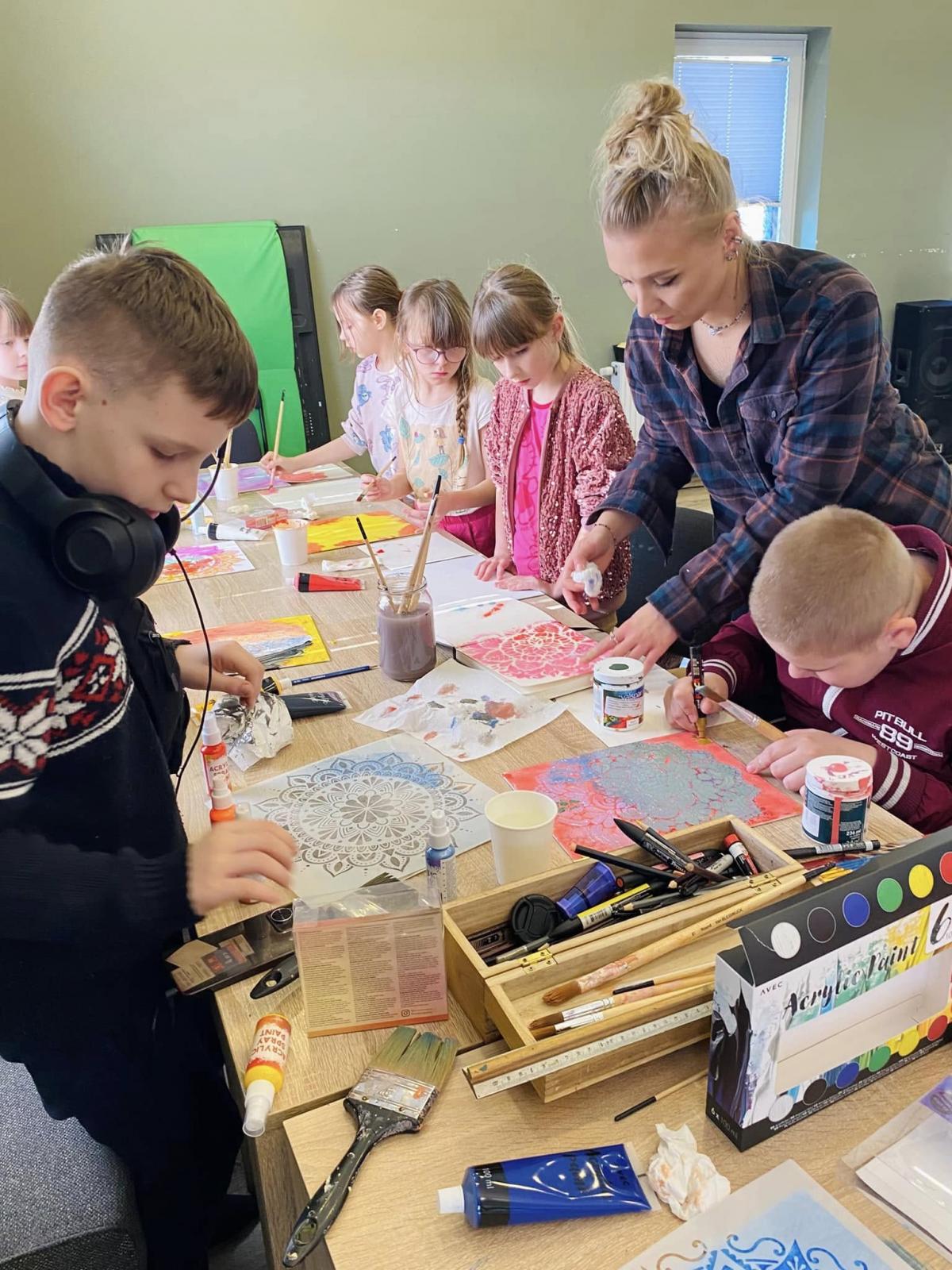 - warsztaty plastyczne z Oluczka, artystką ze Słupska. Dzieci malowały przepiękne mandale na płótnie, wykorzystując szablony, farby, spraye i markery,