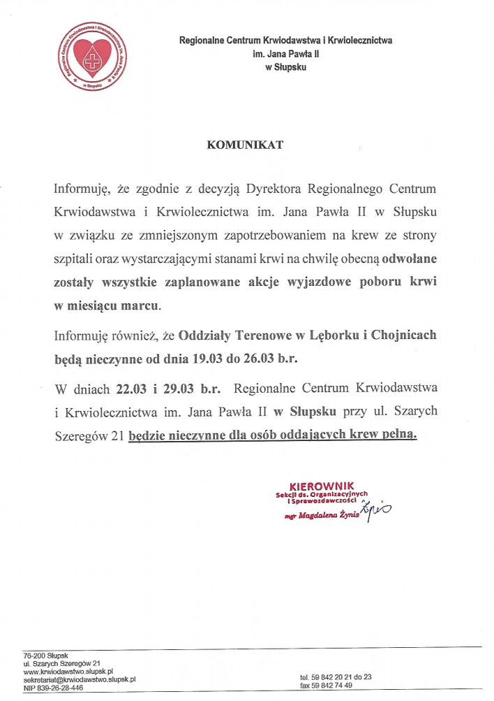 Informacja z Regionalnego Centrum Krwiodawstwa i Krwiolecznictwa w Słupsku