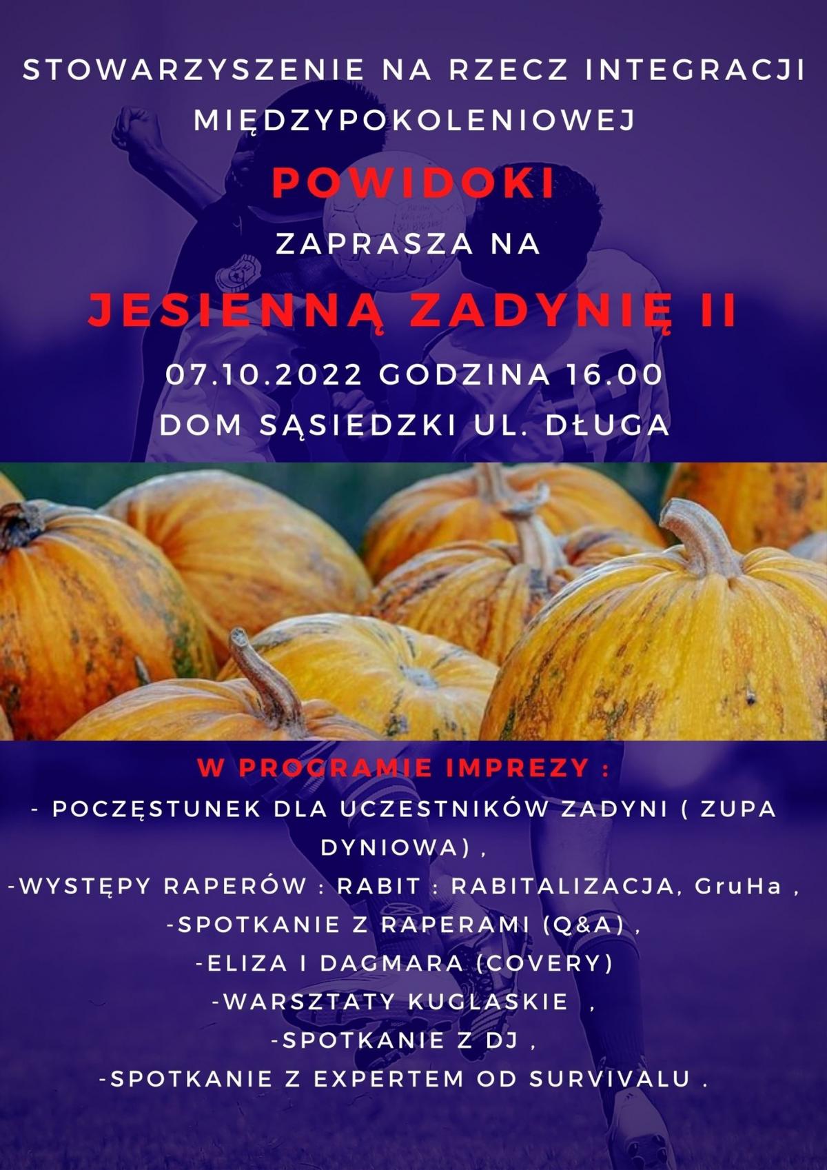 STOWARZYSZENIE NA RZECZ INTEGRACJI MIEDZYPOKOLENIOWEJ POWIDOKI, ma ogromną przyjemność zaprosić WAS, czyli wszystkich chętnych do wspólnej zabawy na JESIENNĄ ZADYNIĘ II