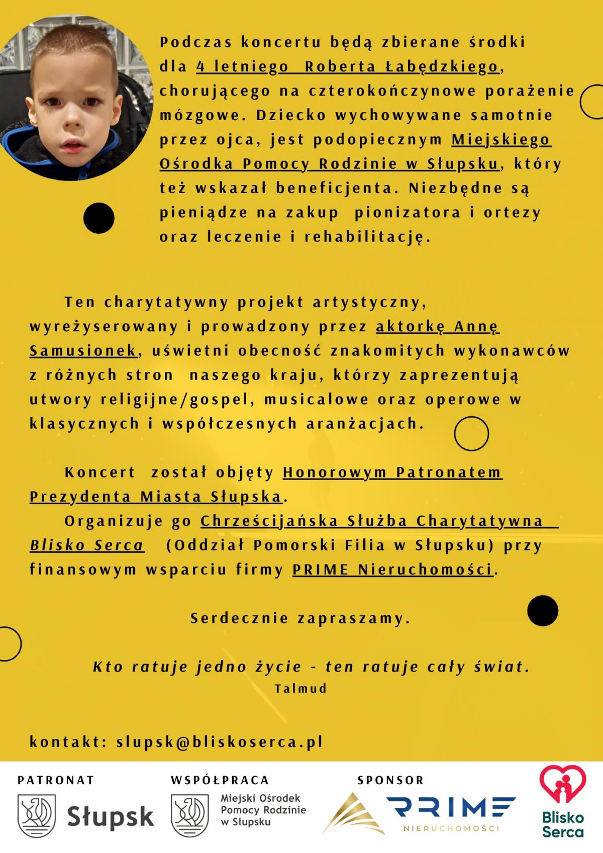 Koncert jest realizowany w Kościele Mariackim dzięki uprzejmości Ks. Proboszcza Zbigniewa Krawczyka. Wydarzenie organizuje Fundacja Blisko Serca (Chrześcijańska Służba Charytatywna) Oddział Pomorski Filia Słupsk przy finansowym wsparciu firmy PRIME Nieruchomości i współpracy naszej instytucji. Wstęp na koncert jest bezpłatny, ale w trakcie jego trwania będą zbierane datki na rehabilitację chłopca. Serdecznie zapraszamy.