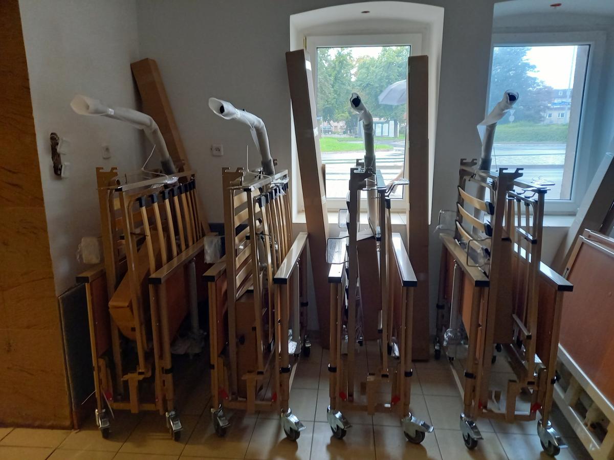 Łóżka zostały już przez nas rozpakowane i oklejone logo Joannitów - są gotowe do wydawania.