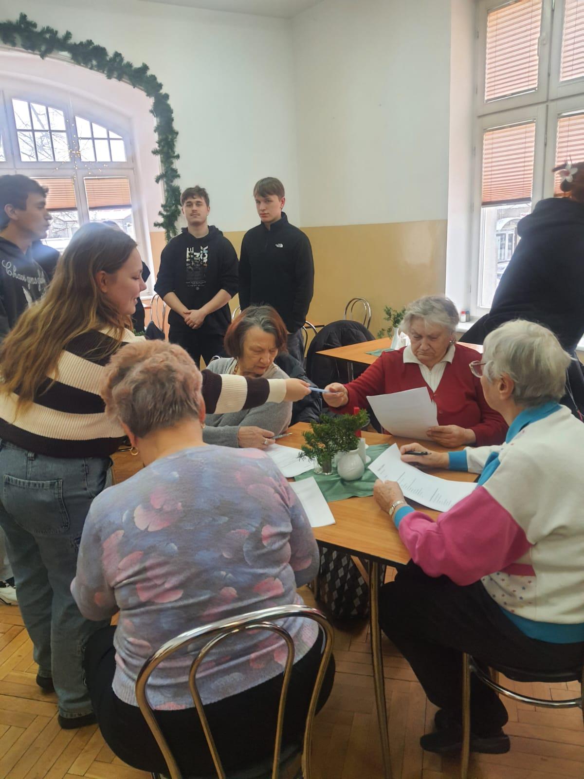 Uczniowie, pracując w zespołach przeprowadzili ankiety wśród seniorów.
