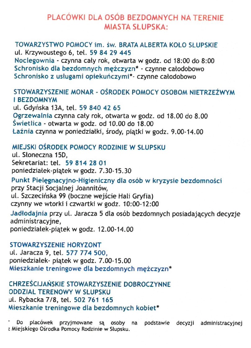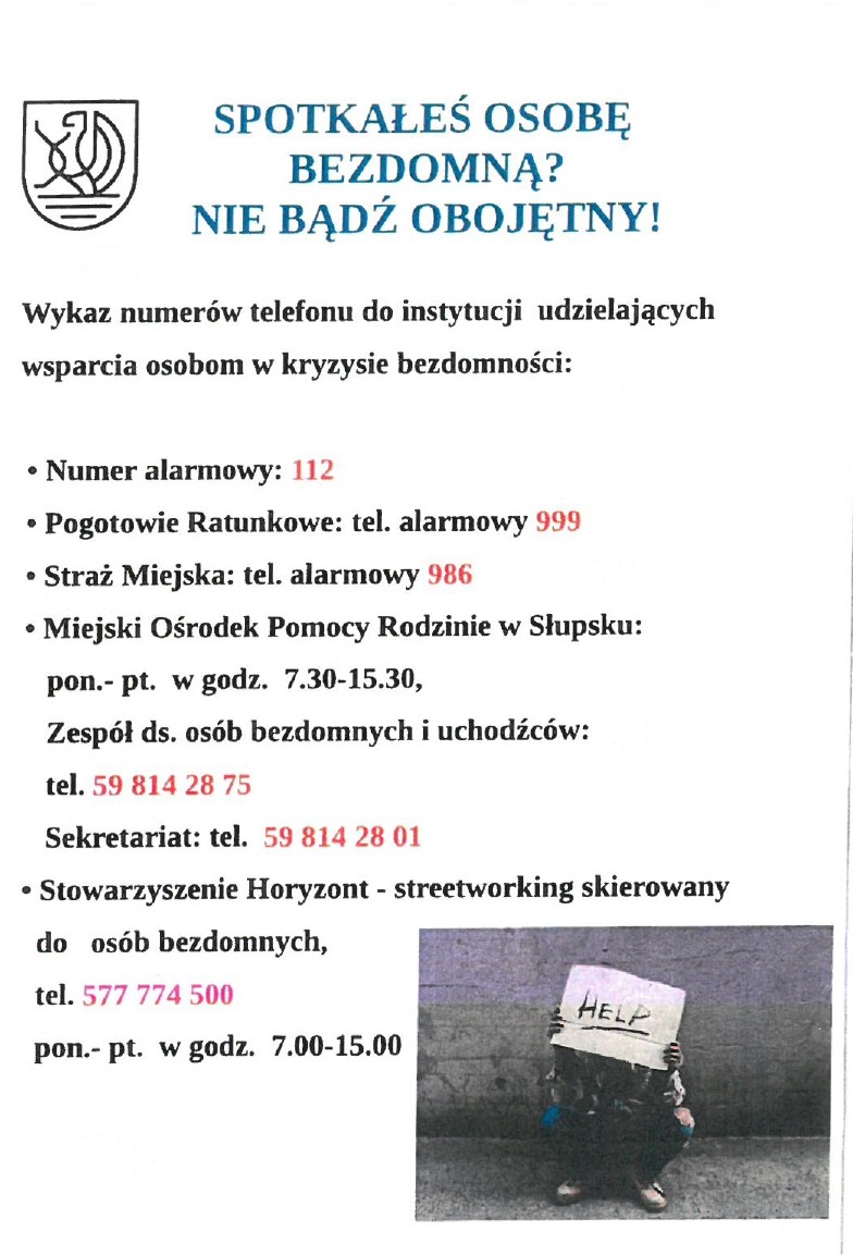 Poniżej prezentujemy przygotowany przez Miasto Słupsk wykaz numerów telefonów do instytucji udzielających wsparcia a także listę placówek dla osób w kryzysie bezdomności na terenie naszego miasta