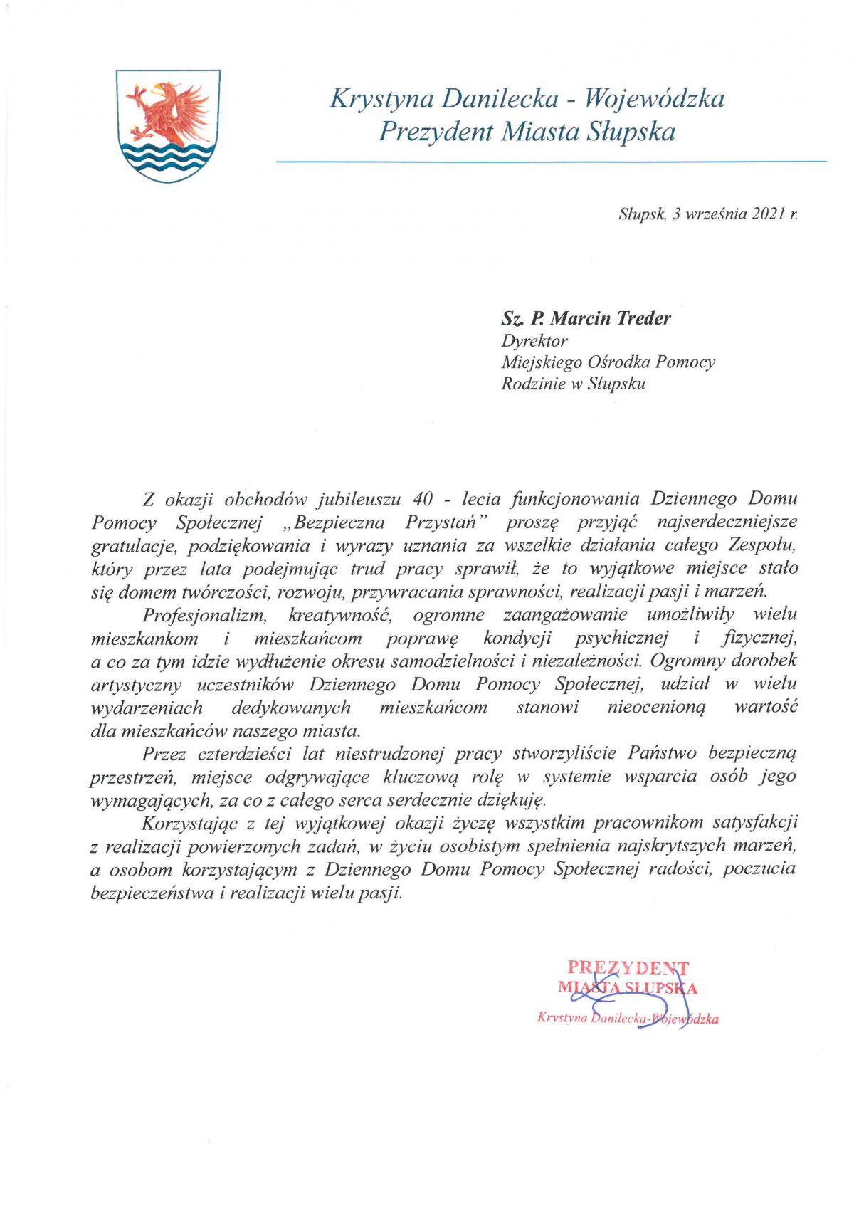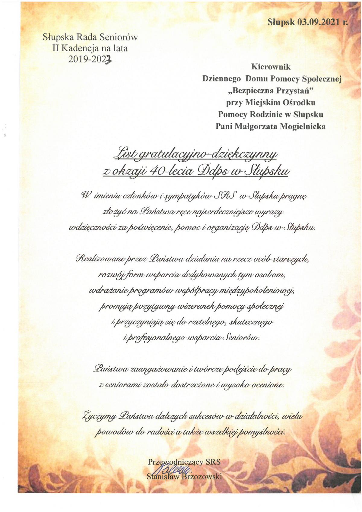 Za nami jubileusz 40-lecia Dziennego Domu Pomocy Społecznej „Bezpieczna Przystań”, który odbył się w piątek (3.09.2021) Było wiele okazji do wzruszeń, radości, uśmiechów i podziękowań. Swoją obecnością zaszczyciły nas władze miasta z P. Markiem Golińskim – Zastępcą Prezydenta Miasta Słupska.