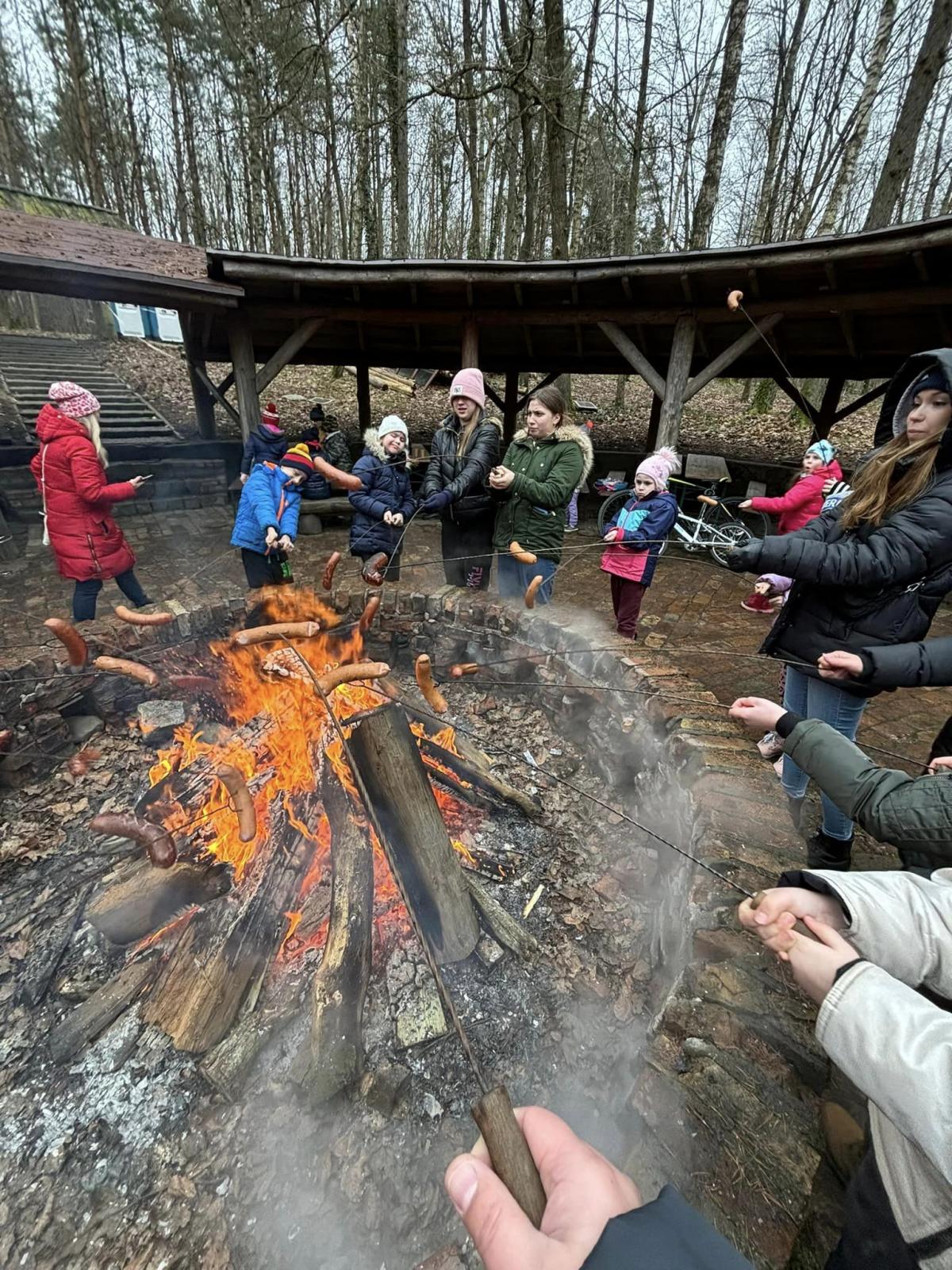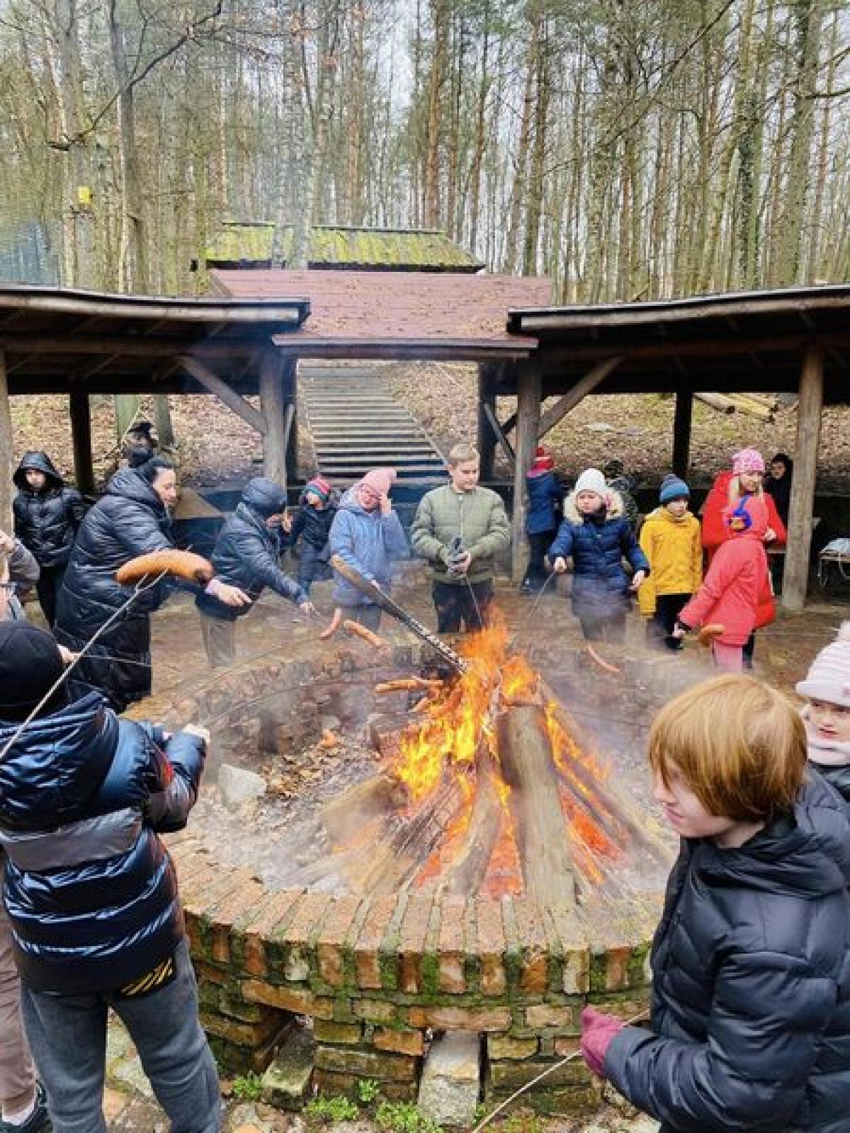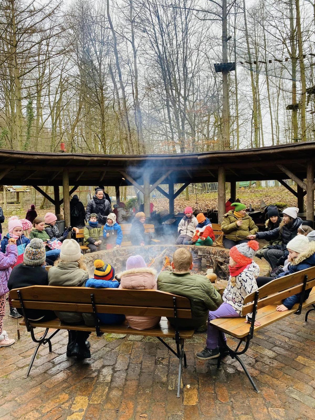 Na zakończenie ferii dzieci wybrały się na spacer po zimowej scenerii lasu. W parku „Leśny Kot” czekał gorący żurek i ognisko. Odbyły się zabawy ruchowe i gry.