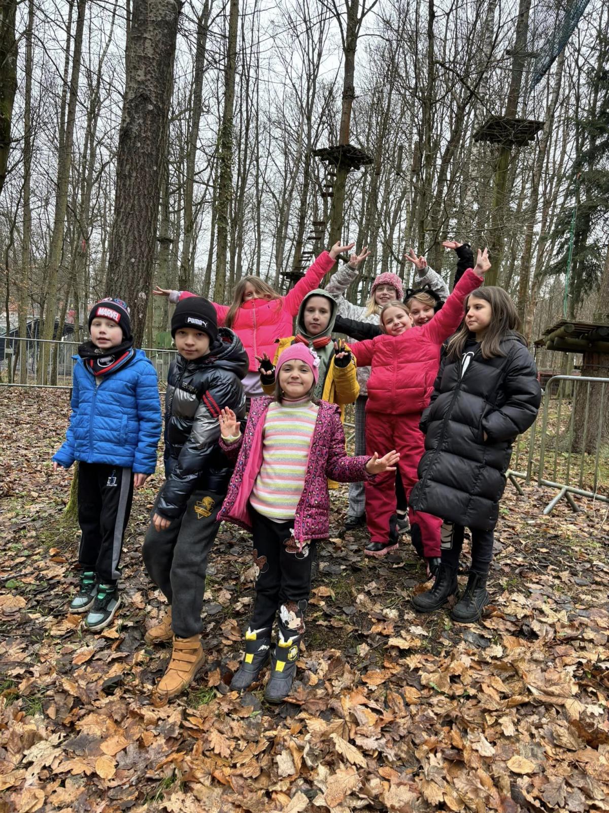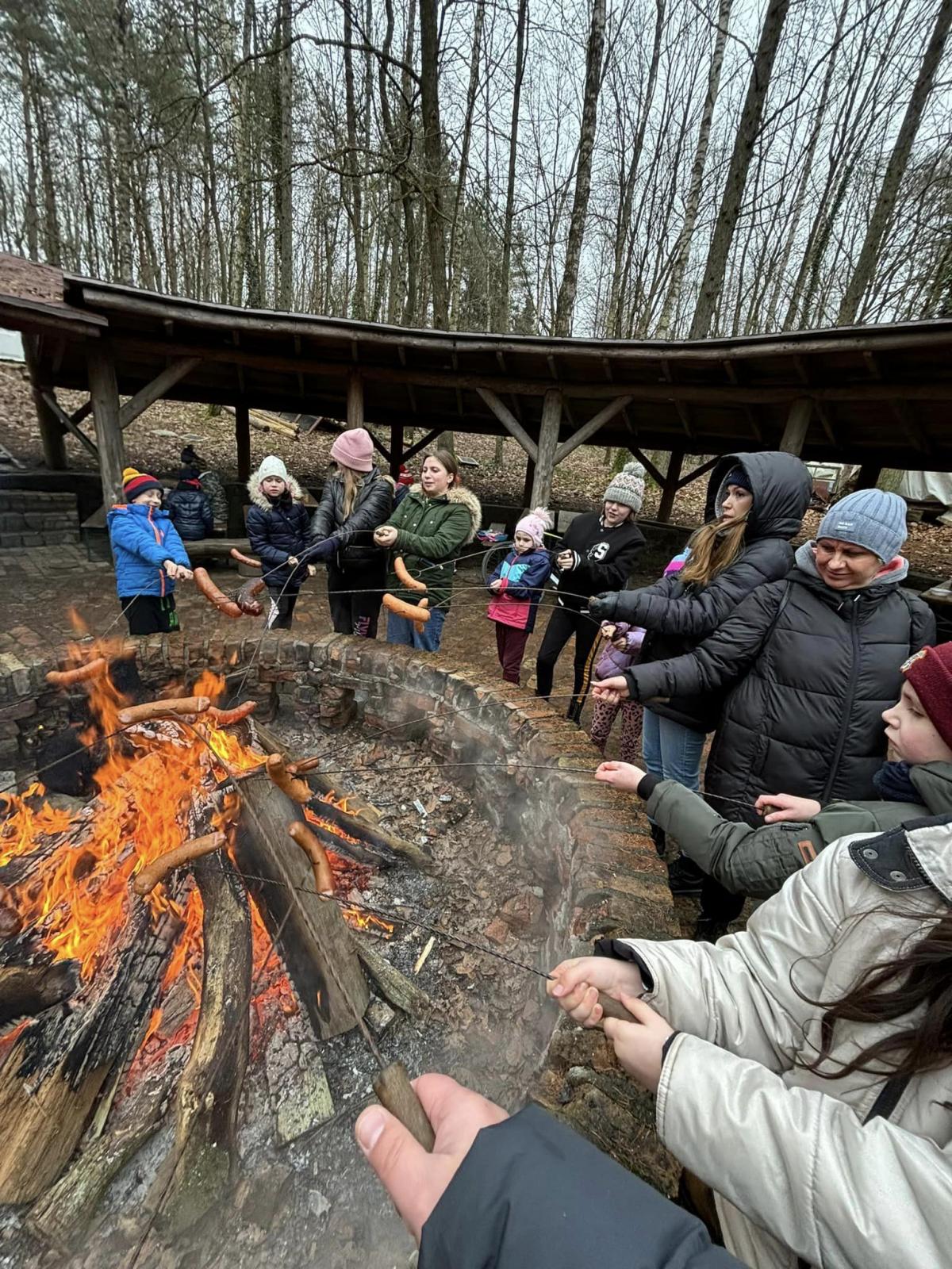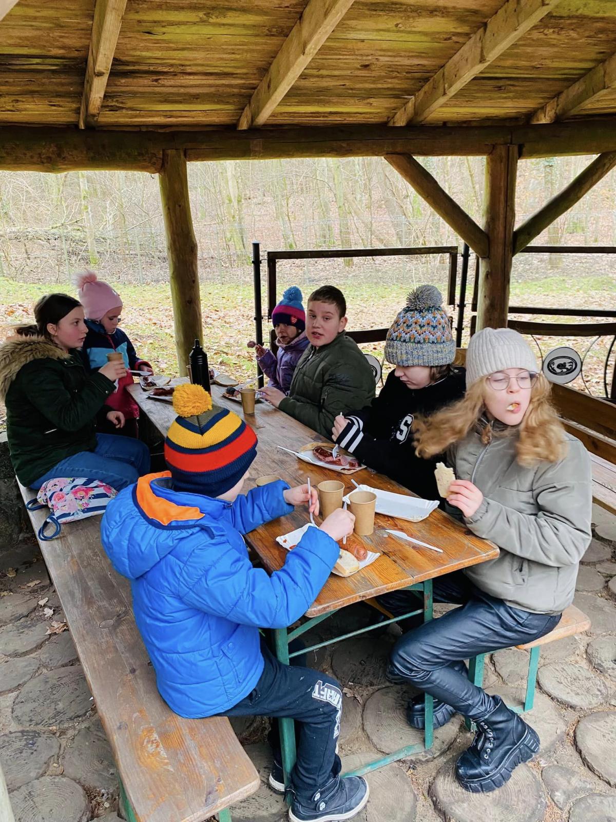 Na zakończenie ferii dzieci wybrały się na spacer po zimowej scenerii lasu. W parku „Leśny Kot” czekał gorący żurek i ognisko. Odbyły się zabawy ruchowe i gry.