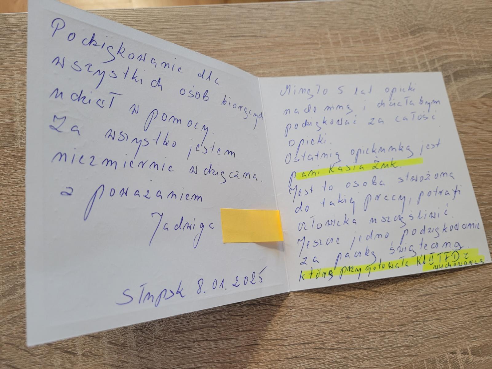 Otrzymaliśmy miłą kartką z podziękowaniami od naszej podopiecznej!