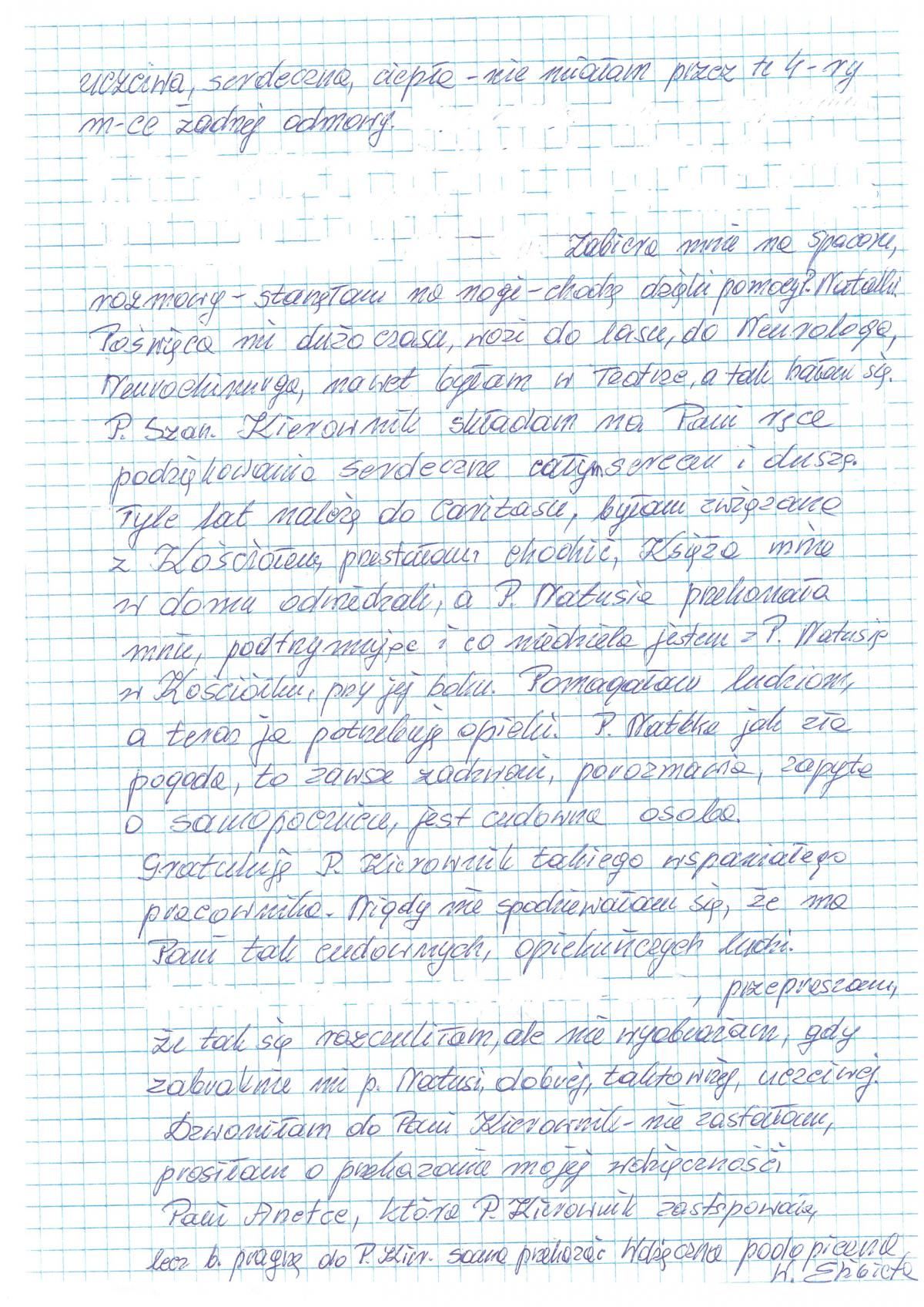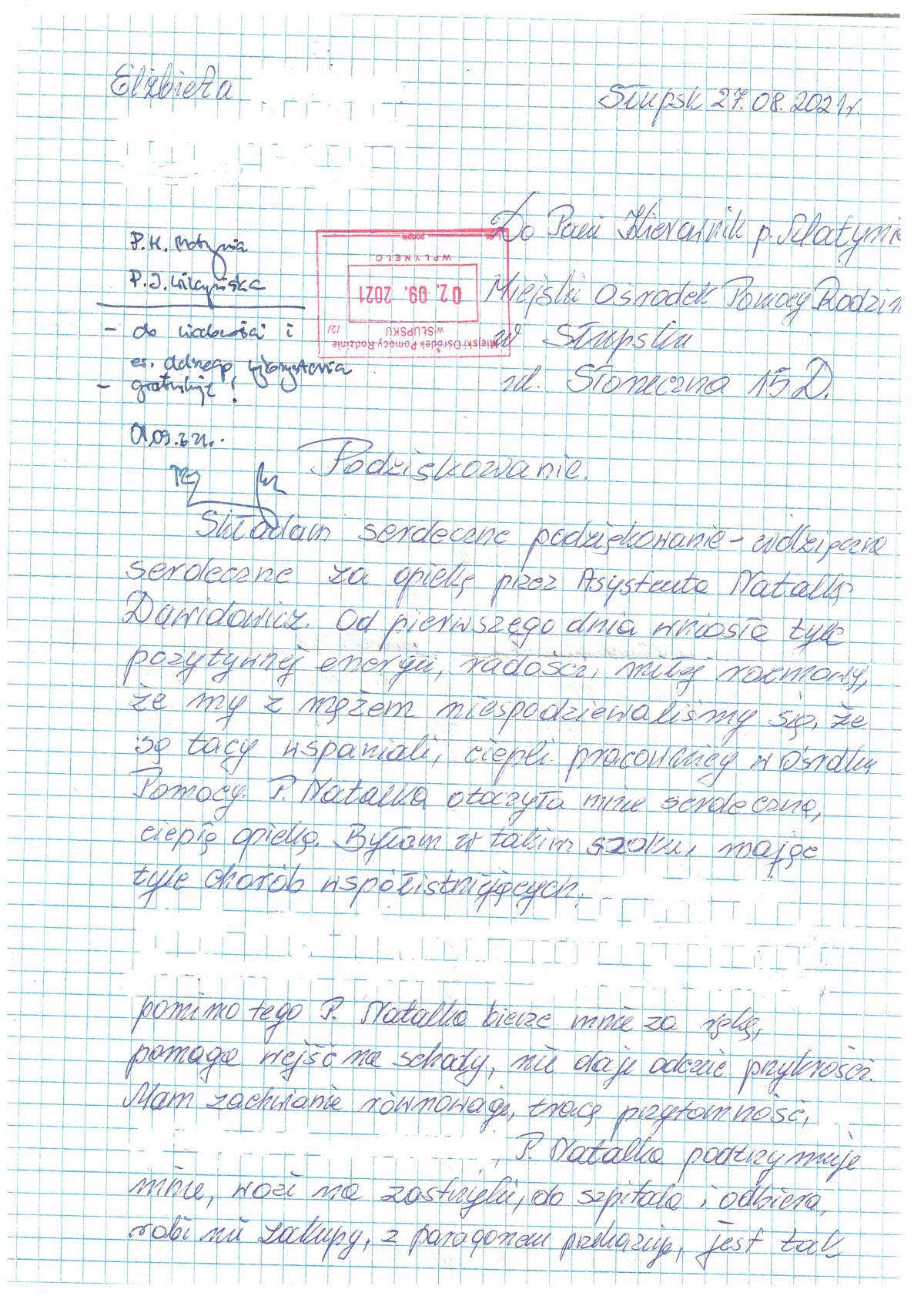 Jedną z takich osób jest m.in. P. Elżbieta, która napisała list opisujący jej wdzięczność za działania asystentki P. Natalii Dawidowicz, który publikujemy poniżej. Ukryliśmy w nim tematy, które nasza podopieczna nie chciałaby upubliczniać.