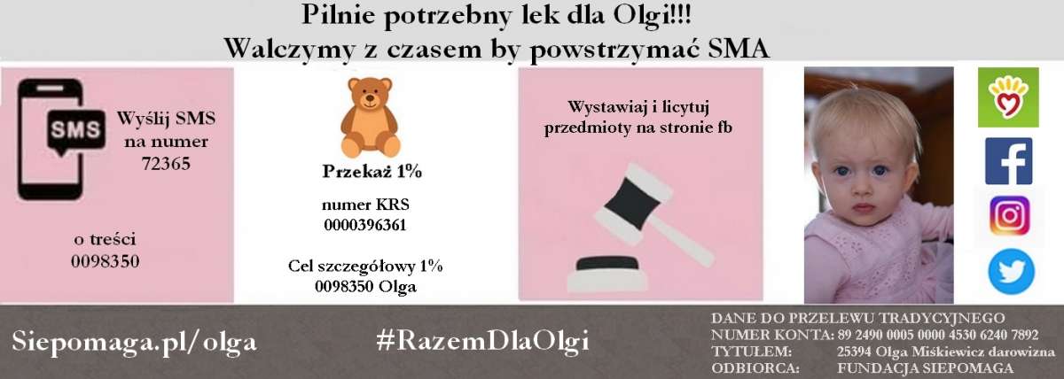 - To wprost niewyobrażalna kwota, ale nieraz już okazało się, że dzięki ludziom dobrej woli, nie ma rzeczy niemożliwych – informują pracownicy GOPS-u. - Pomoc Oldze zaczęliśmy lokalnie: pracownicy Urzędu Gminy Kiszkowo, Ośrodka Pomocy, uczniowie i nauczyciele ZSP, handlowcy, mieszkańcy, social media. Jednak w małej 5-tysięcznej gminie taka pomoc to za mało! Dlatego konieczne jest wsparcie płynące z całego kraju! Musimy wyjść poza ramy małej wielkopolskiej gminy i dotrzeć do każdego Polaka, by dać 14-miesięcznej Oldze szansę na wyzdrowienie!