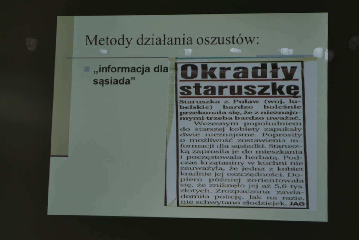 Kolejna prelekcja odbyła się dzisiaj (9.07.2020 r.) w Domu Sąsiedzkim, a była ona skierowana do naszych seniorów. Temat spotkania dotyczył metod oszustw ludzi starszych. Nasi podopieczni dowiedzieli się, że są to nie tylko metody „na wnuczka”, czy „policjanta”. Jest ich znacznie więcej, dlatego spotkanie należy uznać za bardzo udane, bowiem seniorzy mieli mnóstwo pytań i otrzymali przydatne informacje do walki z oszustami. Dowiedzieli się jak postępować w sytuacjach, kiedy ktoś chce ich oszukać.
