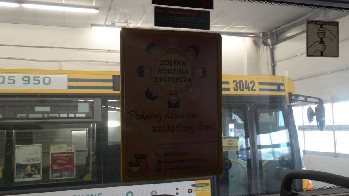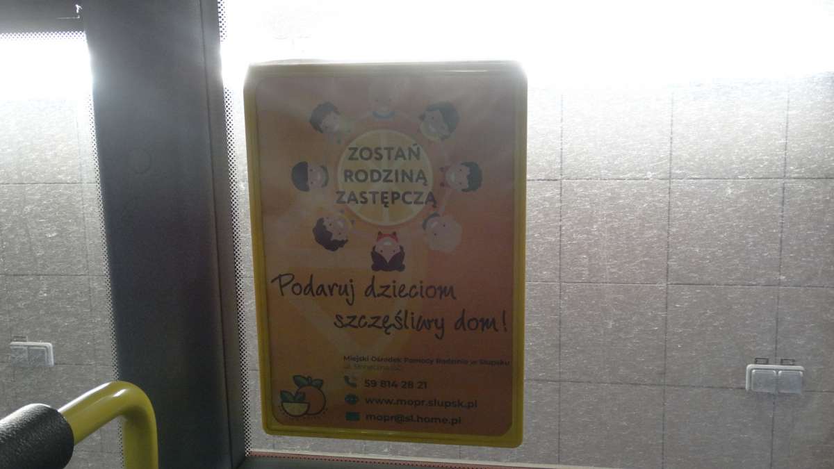 Plakaty promujące akcję „Rodzina – Dzieciom” już wiszą w autobusach miejskich na terenie naszego miasta. Dziękujemy Miejskiemu Zakładowi Komunikacji w Słupsku za okazaną życzliwość i rozpowszechnianie naszego przedsięwzięcia, które ma na celu promocję rodzicielstwa zastępczego wśród mieszkańców Słupska.