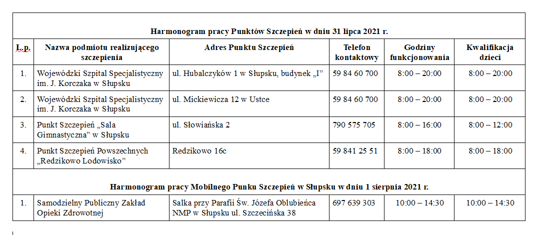Jednocześnie przypominamy, że na terenie miasta Słupska istnieje możliwość darmowego dowozu na szczepienie, dedykowane osobom z niepełnosprawnościami oraz tym, które z obiektywnych przyczyn nie mogą samodzielnie dotrzeć do najbliższego Punktu Szczepień. Transport organizowany jest przez Miejskie Centrum Zarządzania Kryzysowego w Słupsku. Celem umówienia dowozu na szczepienie należy dzwonić w godzinach od 8:00 do 20:00 pod numer: (59) 842 64 67 lub (59) 848 84 97 (693 390 025 – SMS dla osób niesłyszących i niedosłyszących).
