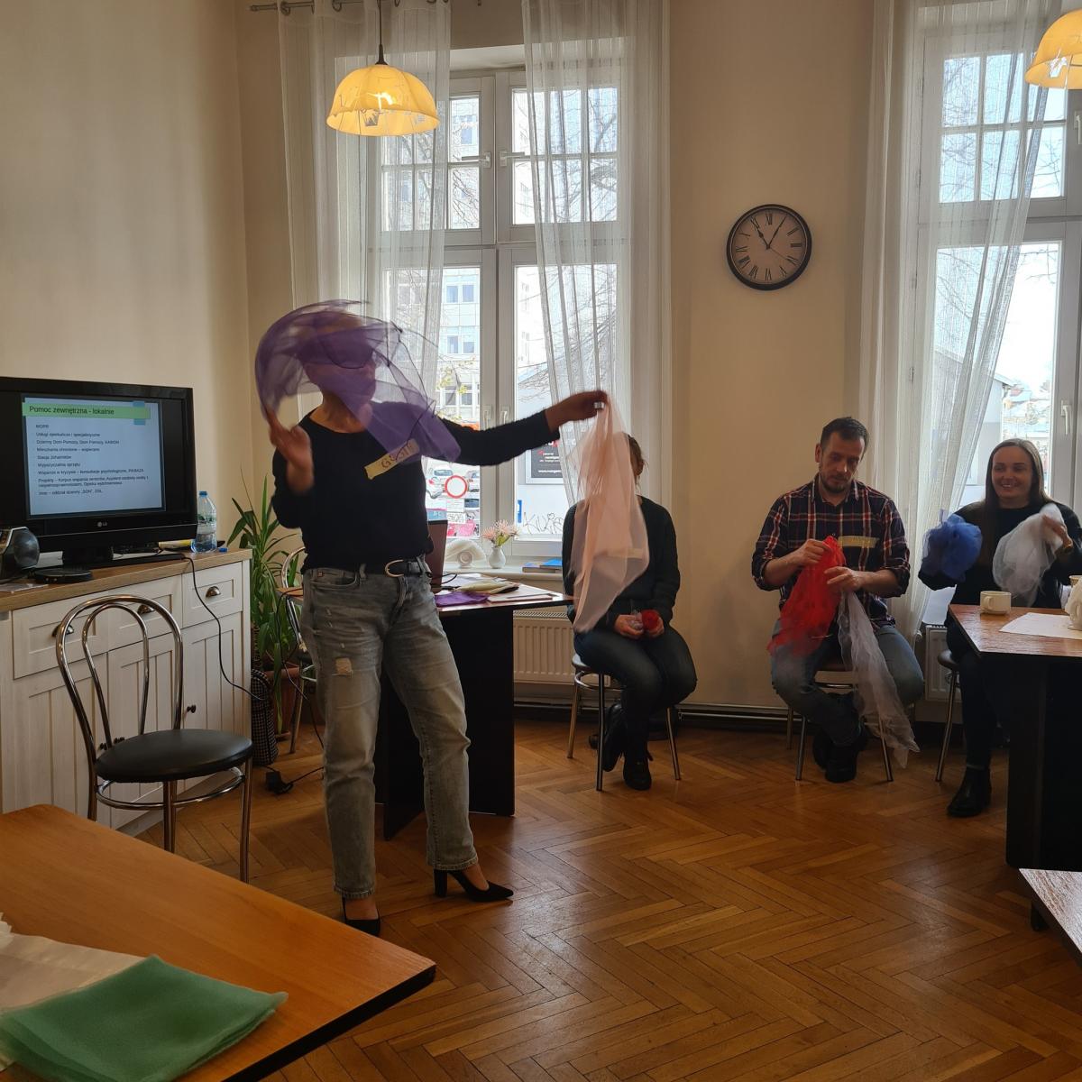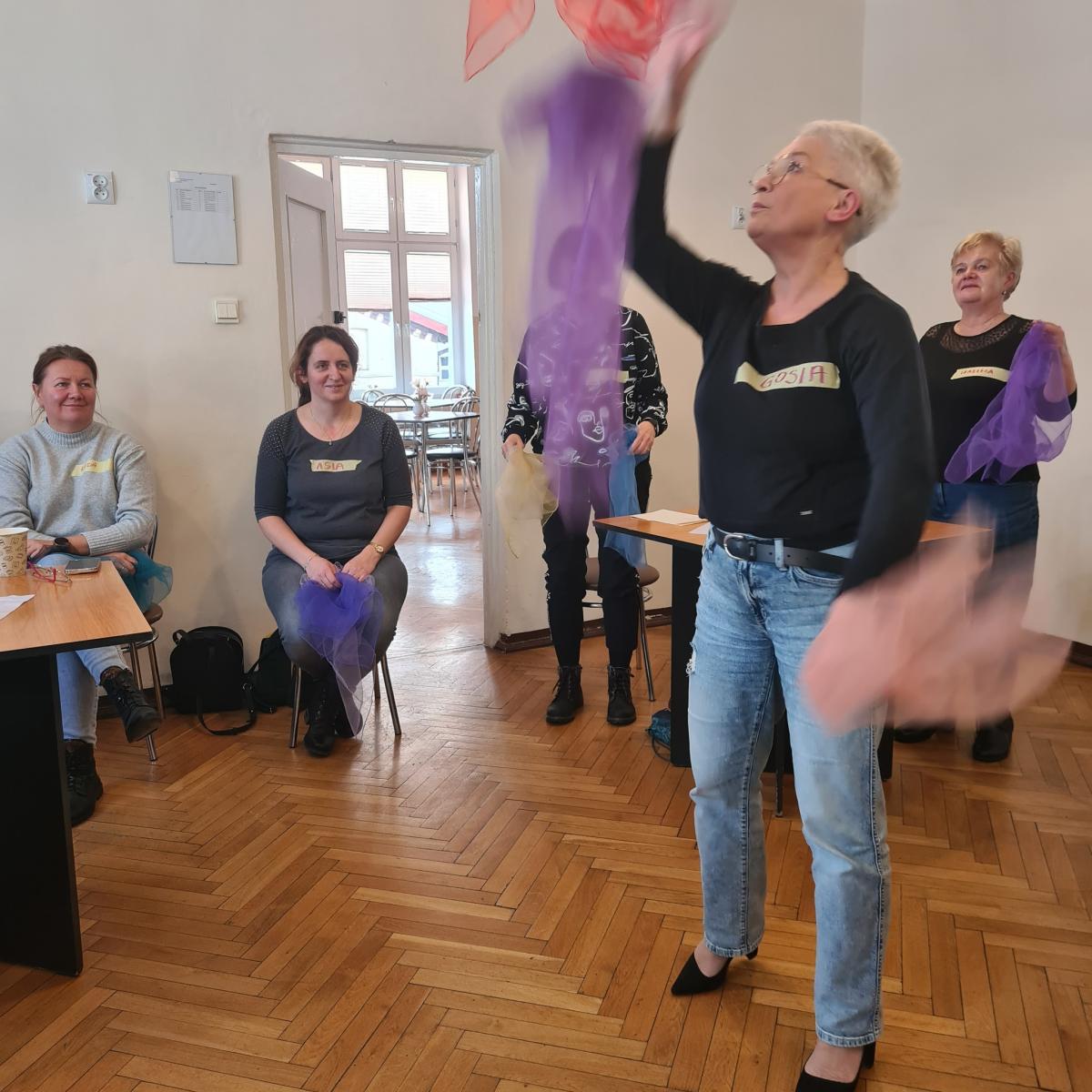 Podczas spotkania, które poprowadziła Małgorzata Mogielnicka, omówione zostały pozamedyczne aspekty opieki nad osobami z chorobami otępiennymi w późnym okresie życia z wieloma przykładami o codzienności z demencją przeplatanymi tańcem i energetycznymi zabawami z kolorowymi apaszkami.
