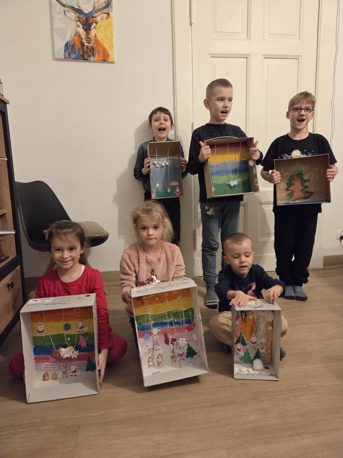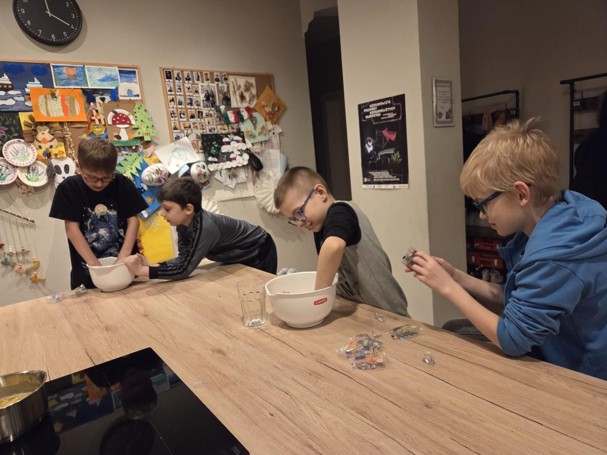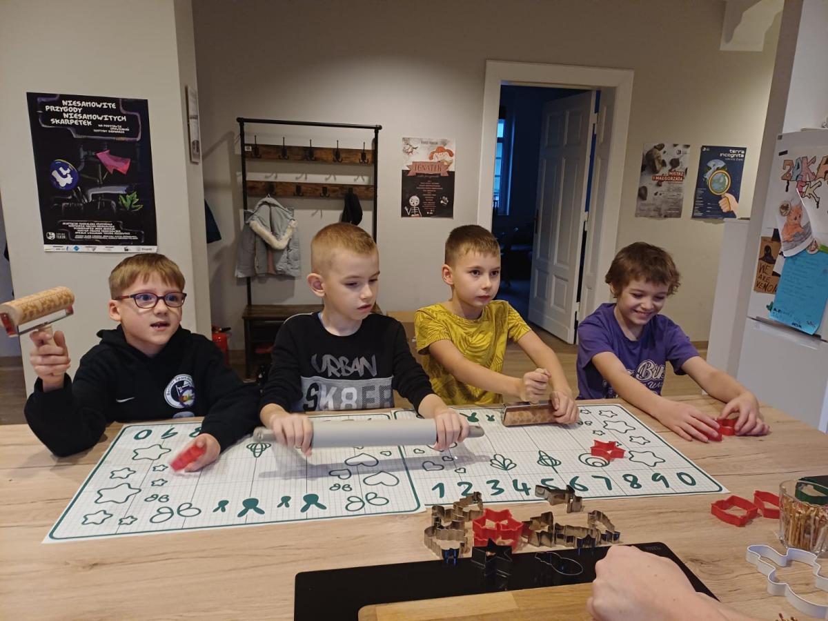 Podczas grudniowych spotkań dzieci z entuzjazmem piekły i zdobiły pierniki, tworząc kolorowe, pachnące dzieła sztuki. Nie zabrakło również zajęć plastycznych – powstawały świąteczne stroiki, ozdoby choinkowe, kartki bożonarodzeniowe oraz nastrojowe lampiony. Wspólne ubieranie choinki stało się okazją do rozmów, śmiechu i dzielenia się świątecznymi tradycjami. Zajęcia kulinarne pozwoliły dzieciom poznać podstawy pracy w kuchni, a także czerpać radość z przygotowywania prostych, świątecznych smakołyków.