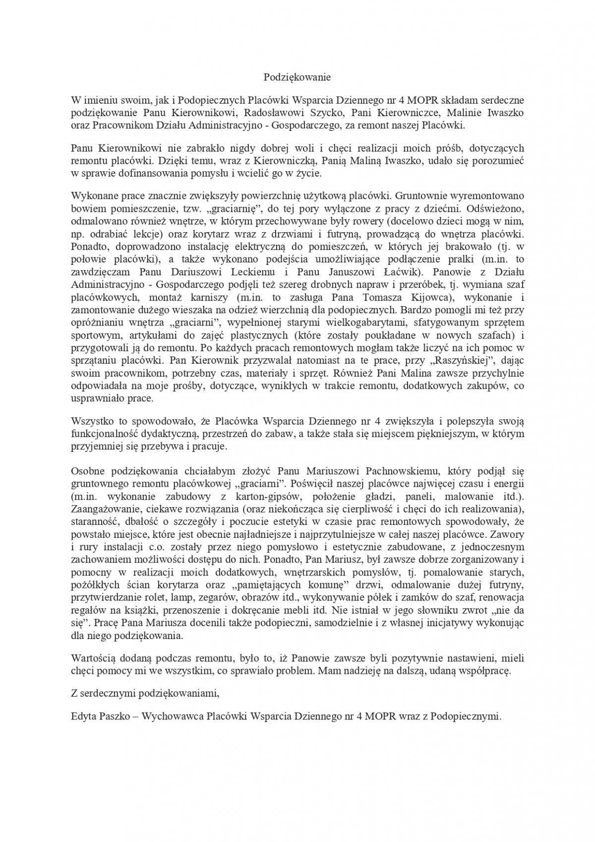 Panu Radosławowi Szycko, Kierownikowi Działu Administracyjno-Gospodarczego, Kierowniczce Placówek, Malinie Iwaszko, a także Panom z Działu Administracyjno-Gospodarczego: Dariuszowi Leckiemu, Januszowi Łaćwikowi, Tomaszowi Kijowcowi, Mariuszowi Pachnowskiemu, którzy przeprowadzili remont, a także pomagali w sprzątaniu Placówki.