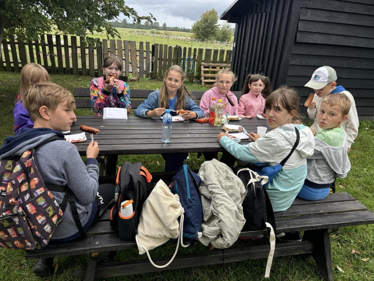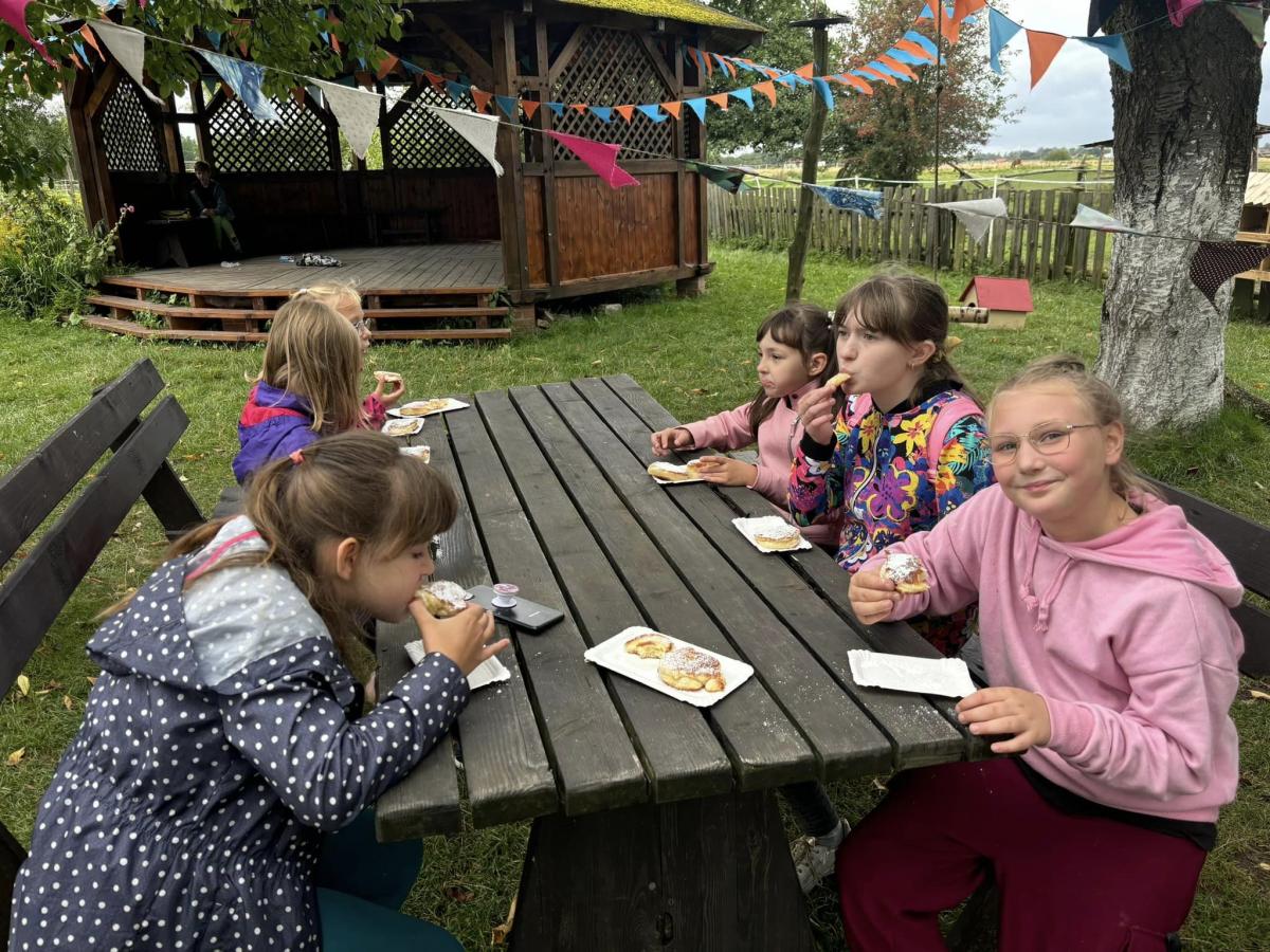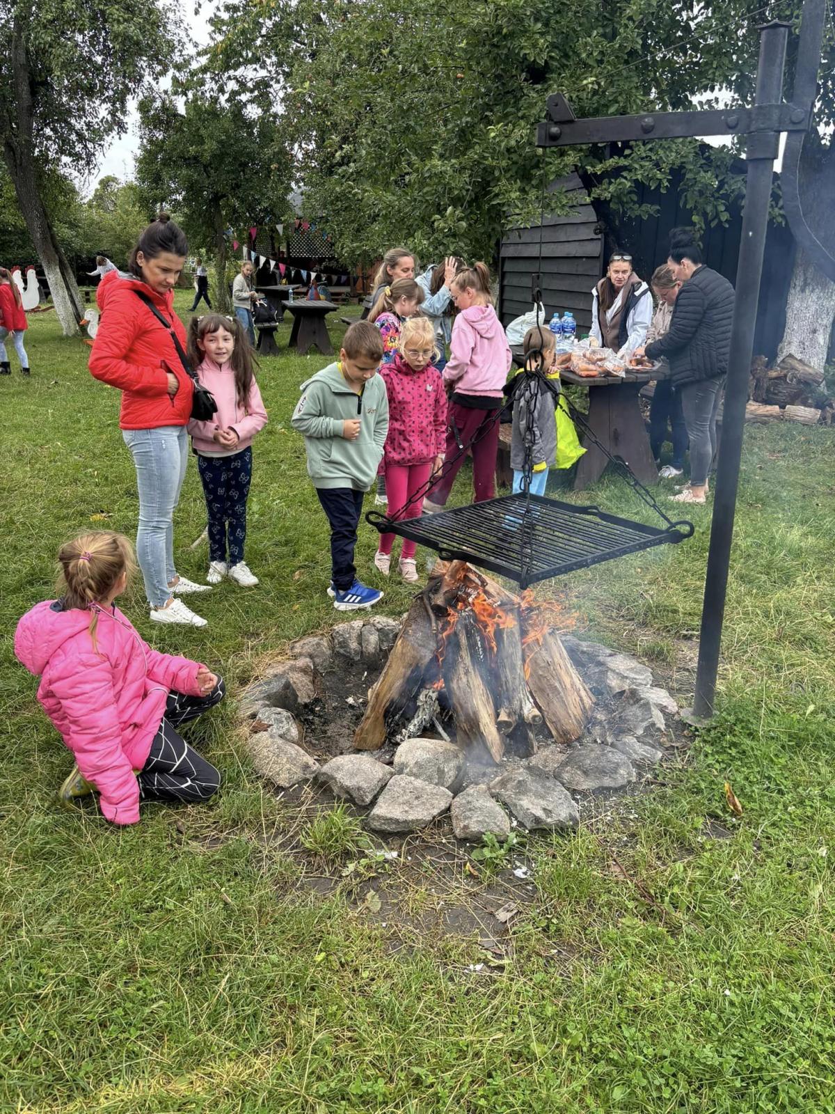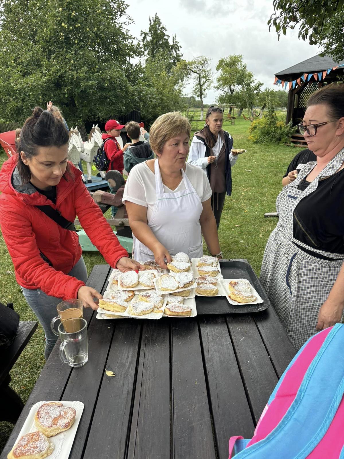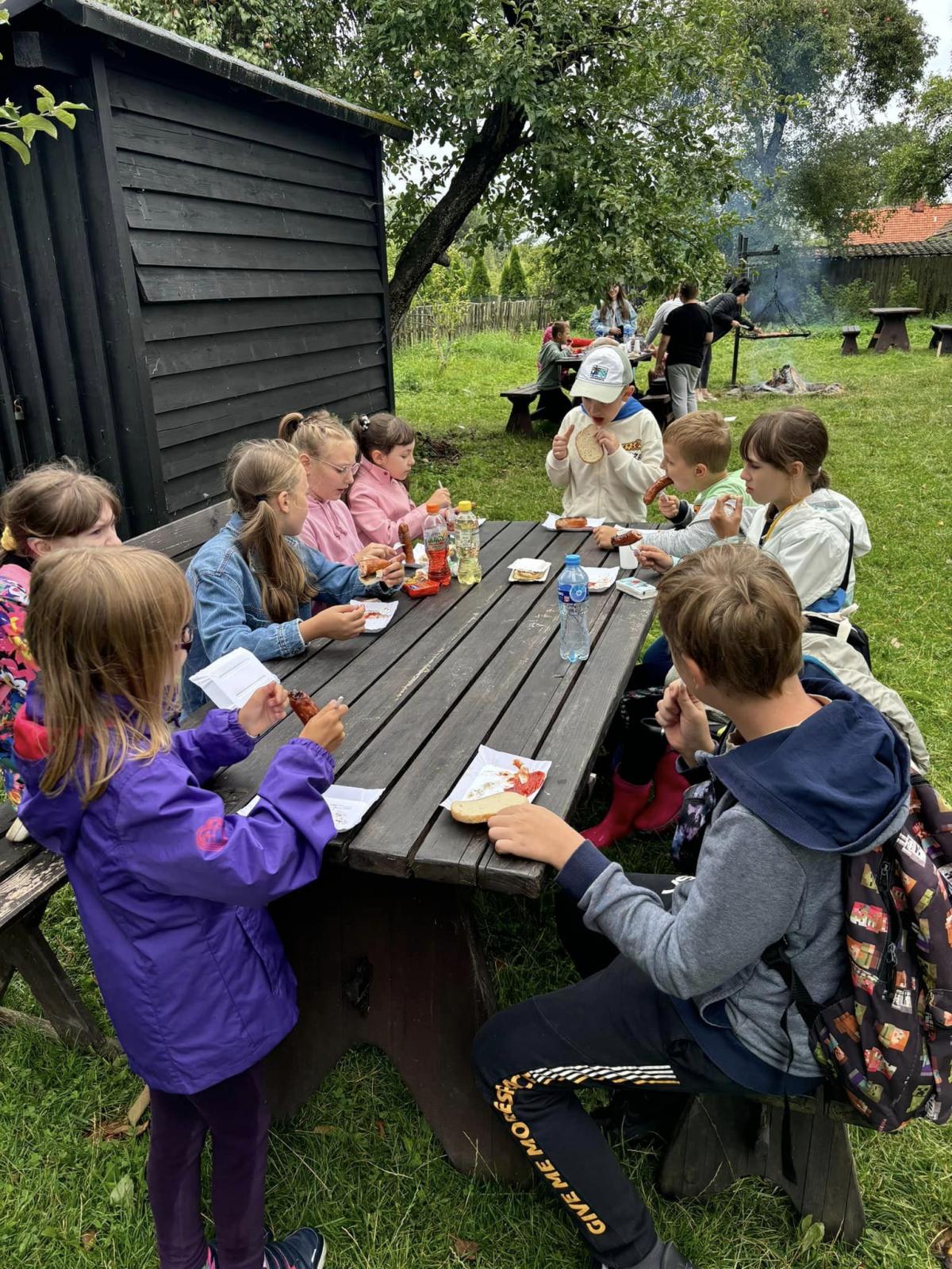 Na dzieci czekał wiejski plac zabaw, a także wystawcy z rękodziełem. Uczestnicy wycieczki zjedli ze smakiem pyszne racuszki usmażone na piecu kaflowym i kiełbaski upieczone nad ogniskiem.